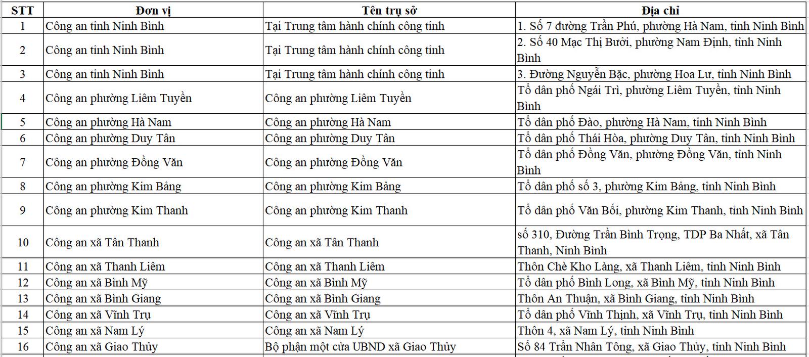 Để tạo điều kiện thuận lợi trong công tác tiếp công dân và giải quyết thủ tục hành chính, Công an tỉnh Ninh Bình thông báo danh sách 39 điểm tiếp nhận hồ sơ cấp căn cước công dân trên toàn địa bàn tỉnh (Danh sách chi tiết kèm theo).
