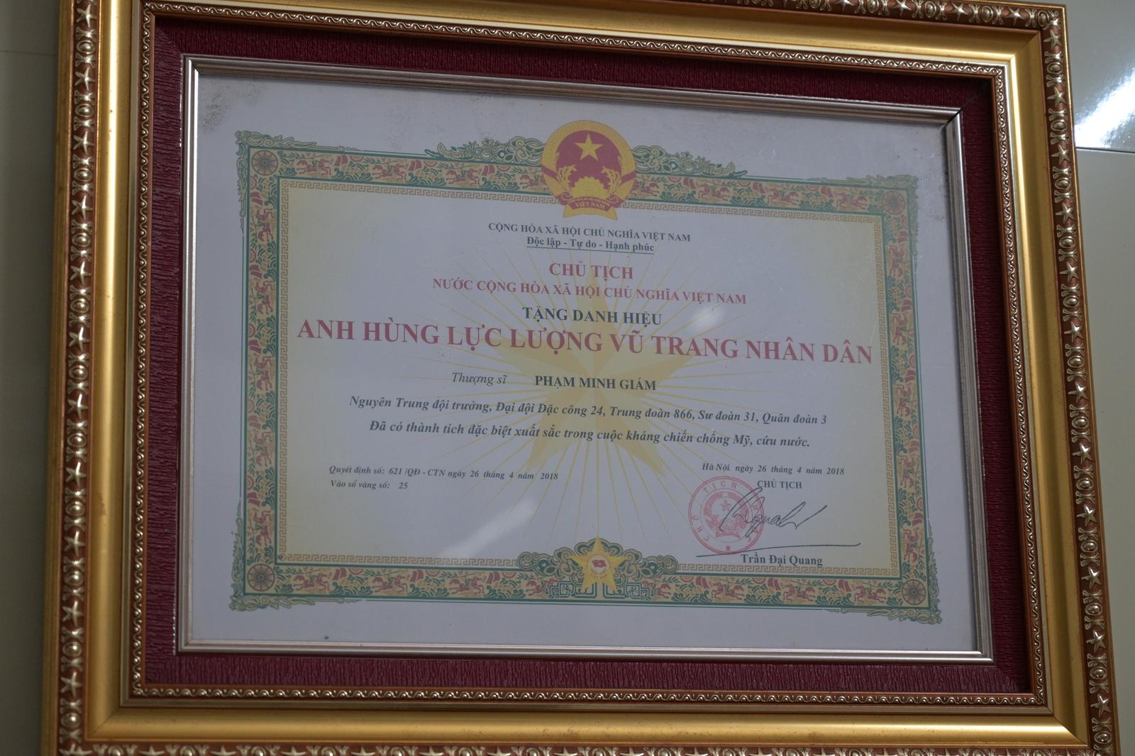 Tấm bằng tặng danh hiệu Anh hùng Lực lượng vũ trang Nhân dân Phạm Minh Giám được treo ngay ngắn nơi góc tường. Ảnh: Phạm Duyệt