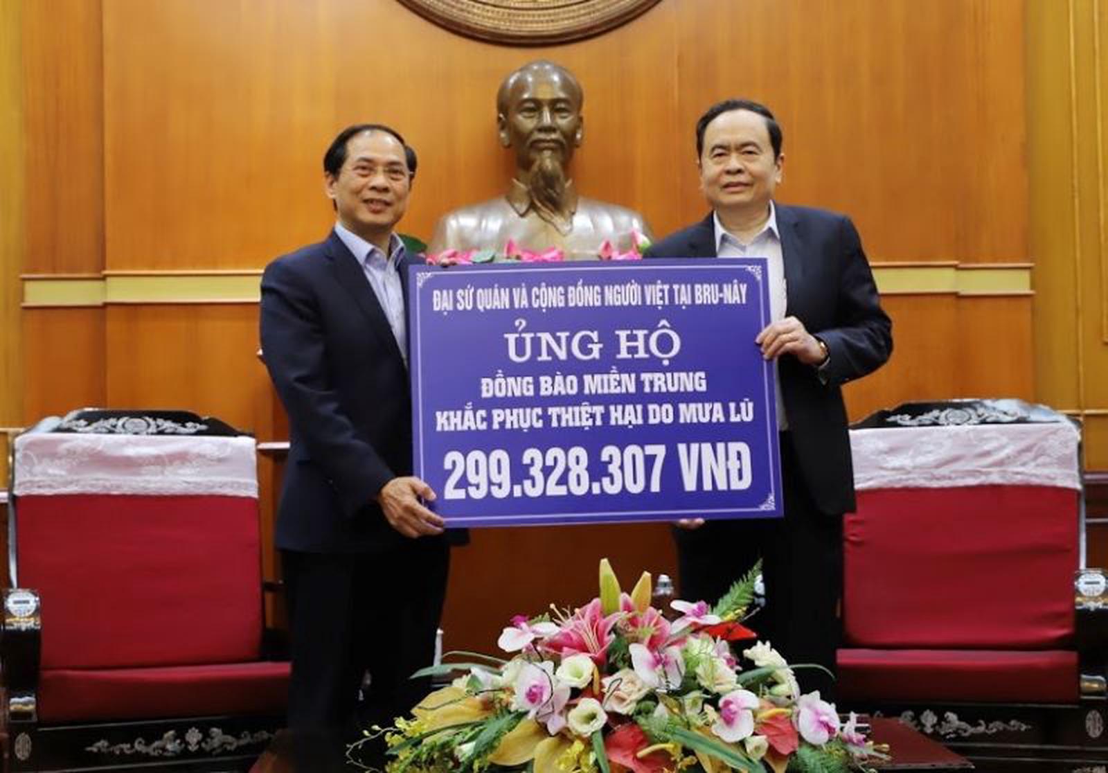 Thứ trưởng Bùi Thanh Sơn đã trao số tiền ủng hộ 299,3 triệu đồng từ Đại sứ quán và cộng đồng người Việt từ Bruney. Ảnh: HD