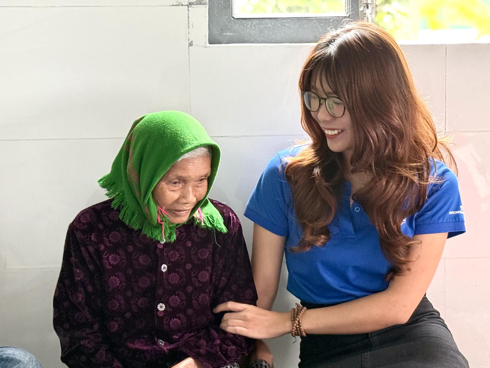 Chị Nguyễn Đoàn Thanh Thảo - Phó Bí thư Đoàn Cơ sở Vietcombank Đắk Lắk chia sẻ niềm vui cùng cụ bà H Lắk Niê. Ảnh: AM