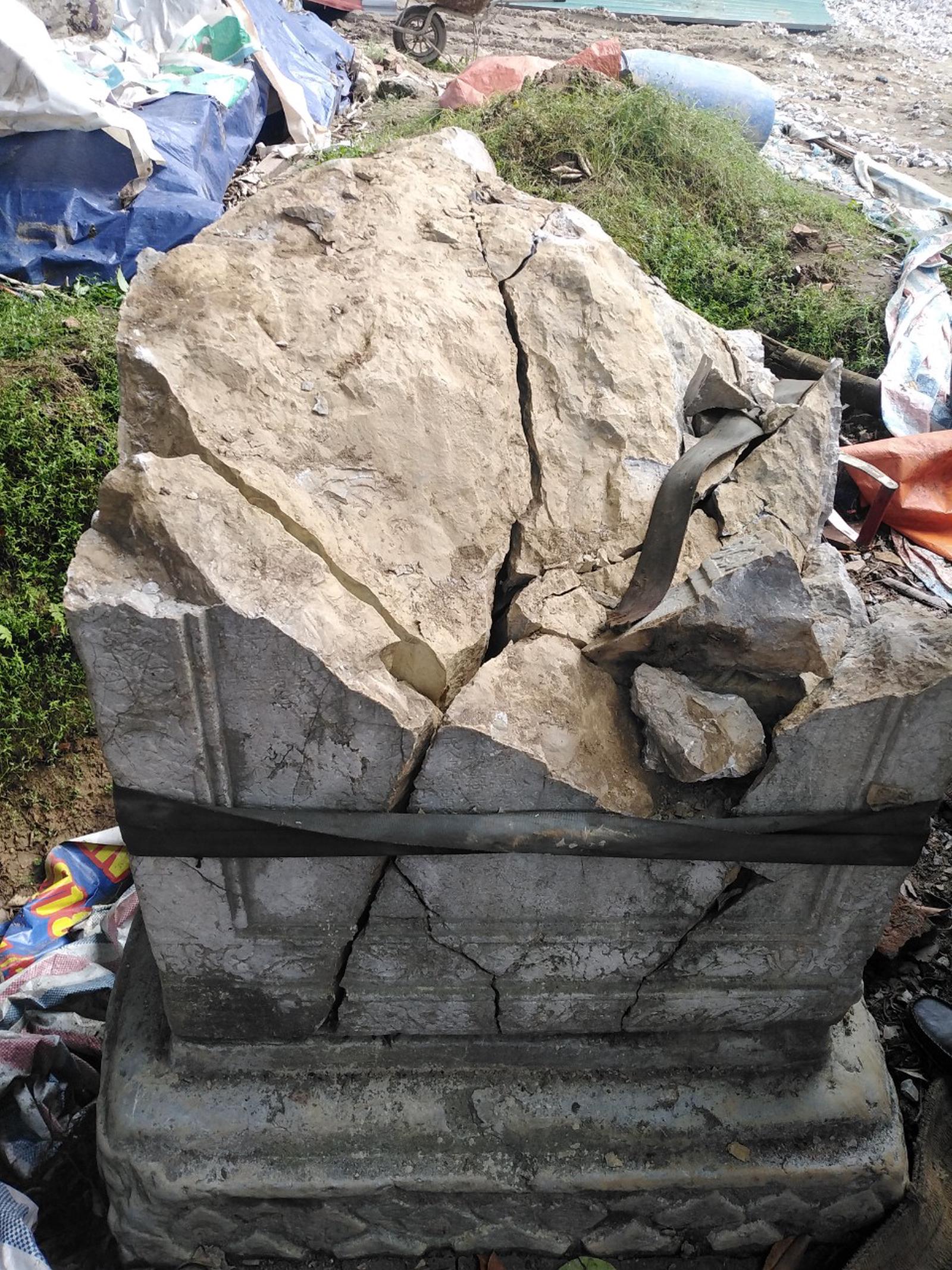 Do hiện trạng tấm bia có rất nhiều vết nứt dập cả ngang, lẫn dọc nên cán bộ giám sát của các bên đã cho gông, bó ngang dọc bởi dây vải (loại dây vải chuyên dụng để cẩu gỗ, đá). Đồng thời, trước khi tiến hành nâng bia bằng cần cẩu, đơn vị thi công đã cho luồn móc thêm dây cẩu vòng quanh phía dưới đế móng bia để tăng cường độ an toàn khi tiến hành cẩu tấm bia. Mặc dù bia đã được gông bó rất cẩn thận, nhưng khi cần cẩu vừa nhấc bia lên, thì bia đã bị tách rời ra thành 2 miếng.