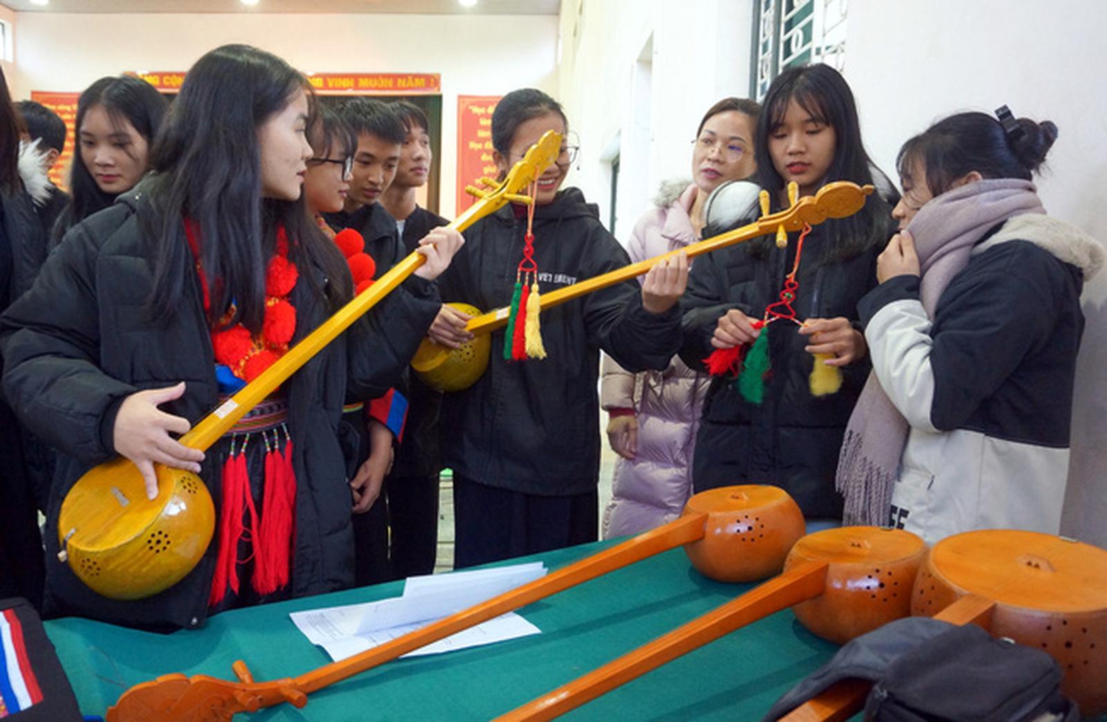 Học sinh Trường Phổ thông Dân tộc nội trú Bắc Kạn tìm hiểu về cây đàn tính. Ảnh: PV