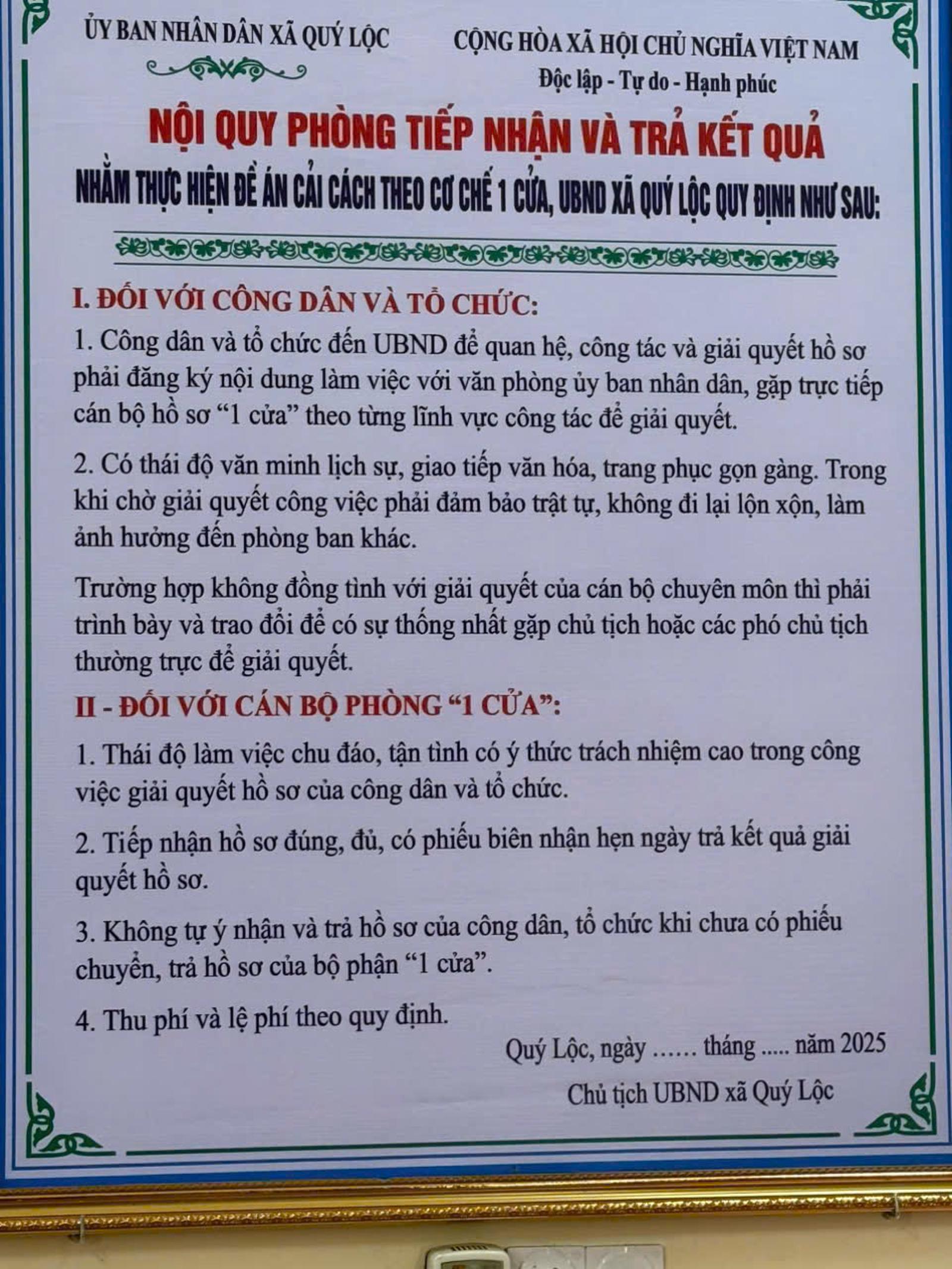 Nội quy tiếp nhận và trả kết quả được công khai ở UBND xã Quý Lộc. Ảnh: Văn Thanh