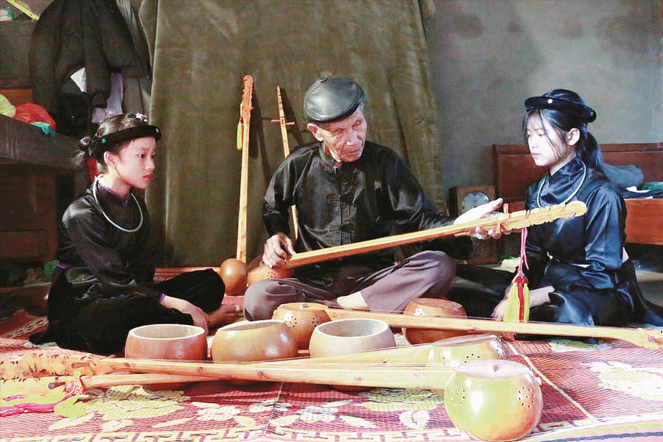 Nghệ nhân ưu tú Lương Thiêm Phú (thôn Chang Nà, thị trấn Bình Liêu, huyện Bình Liêu) truyền dạy nghệ thuật hát then, đàn tính cho thế hệ trẻ. Ảnh: La Lành