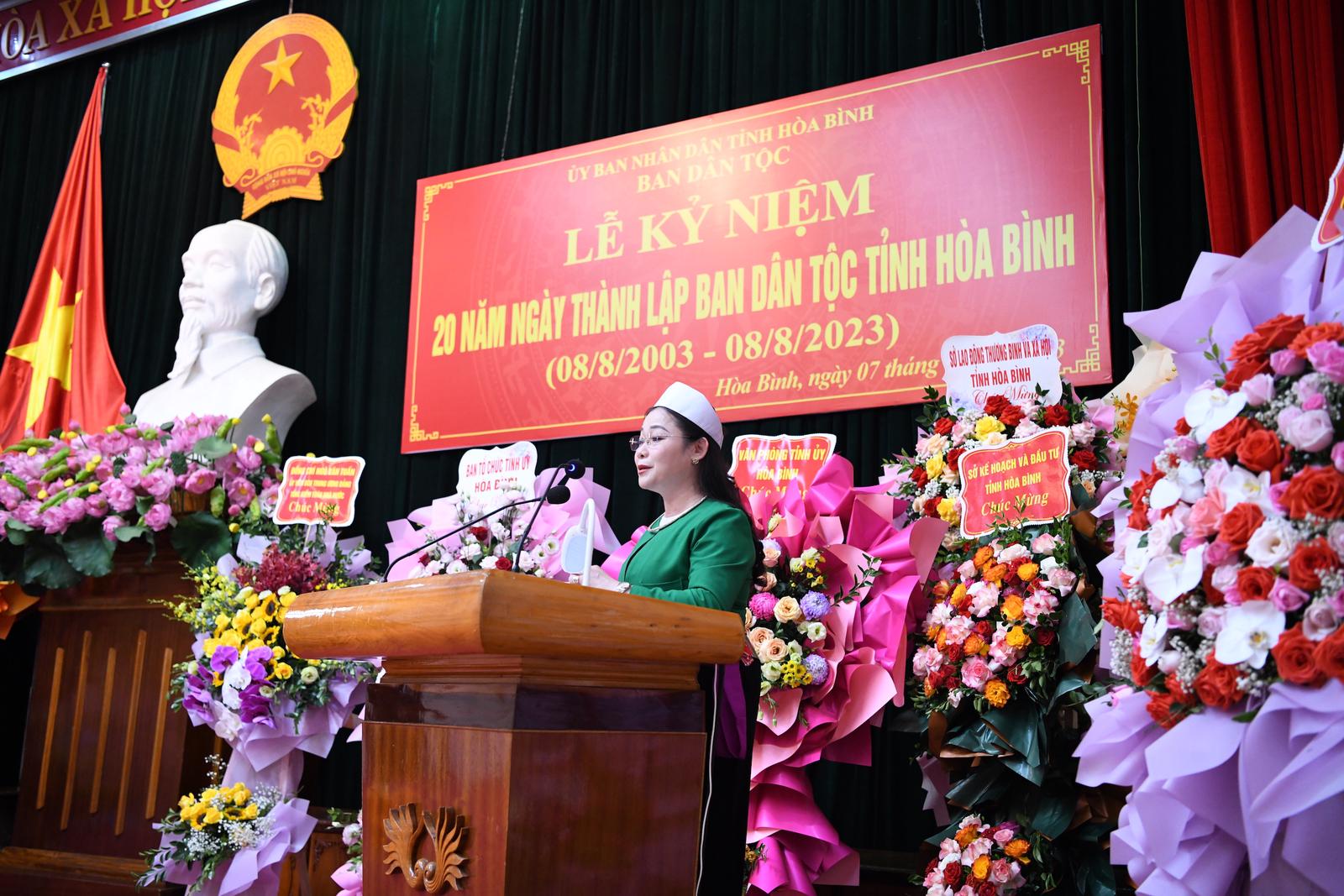 Phát biểu khai mạc tại Lễ kỷ niệm, Trưởng ban Dân tộc tỉnh Hòa Bình Đinh Thị Thảo cho biết, dưới sự lãnh đạo, chỉ đạo của Ủy ban Dân tộc, Tỉnh ủy - HĐND - UBND - UBMTTQ tỉnh, Ban Dân tộc tỉnh luôn đồng hành cùng Nhân dân các dân tộc trong tỉnh tổ chức thực hiện có hiệu quả các chính sách dân tộc của Đảng và Nhà nước, góp phần quan trọng phát triển KT-XH, củng cố khối đại đoàn kết các dân tộc tỉnh.