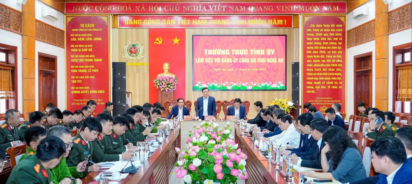 (Thanh tra) - Tại buổi làm việc với Công an tỉnh chiều 27/11, Thường trực Tỉnh uỷ Nghệ An đánh giá cao vai trò nòng cốt của lực lượng Công an tỉnh trong bảo đảm an ninh trật tự, đồng thời yêu cầu tiếp tục chủ động nhận diện, xử lý từ sớm, từ cơ sở mọi nguy cơ phát sinh, không để bị động, bất ngờ.