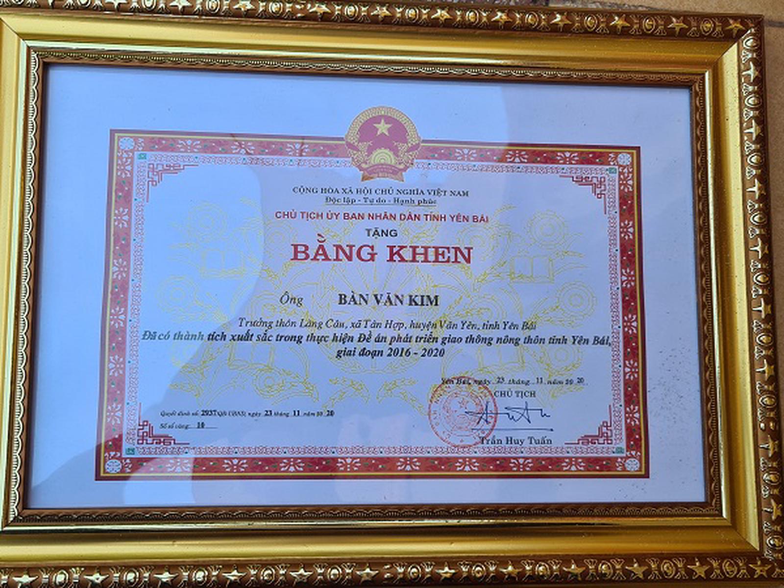 Với sự nhiệt tình, gương mẫu trong phong trào làm đường giao thông nông thôn, mới đây, ông Bàn Văn Kim được Chủ tịch UBND tỉnh Yên Bái tặng bằng khen vì đã có thành tích xuất sắc trong thực hiện Đề án Phát triển giao thông nông thôn tỉnh Yên Bái giai đoạn năm 2016 - 2020.