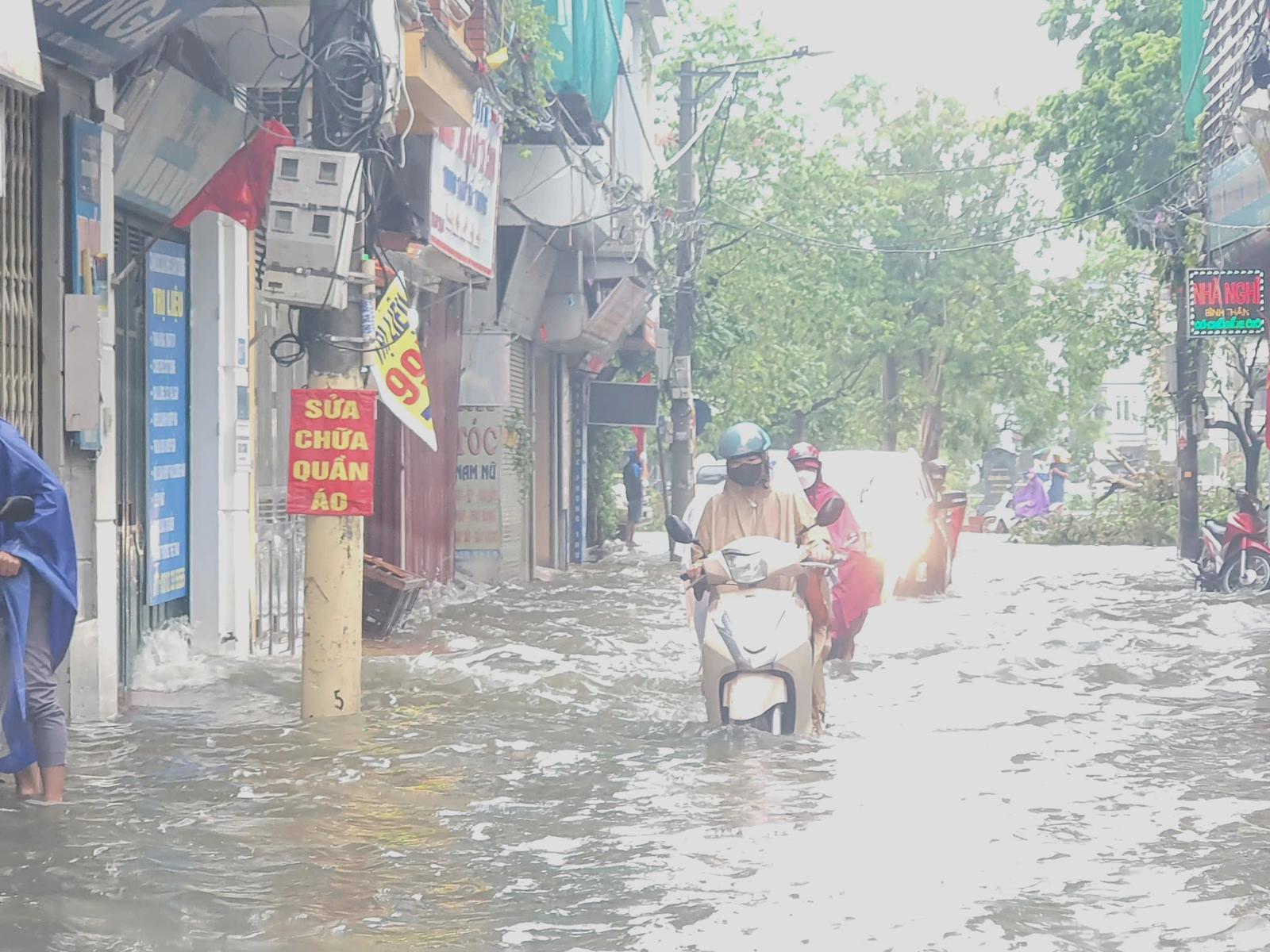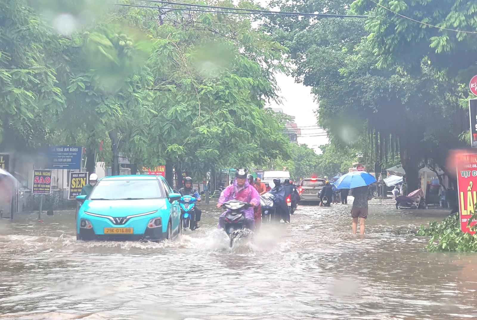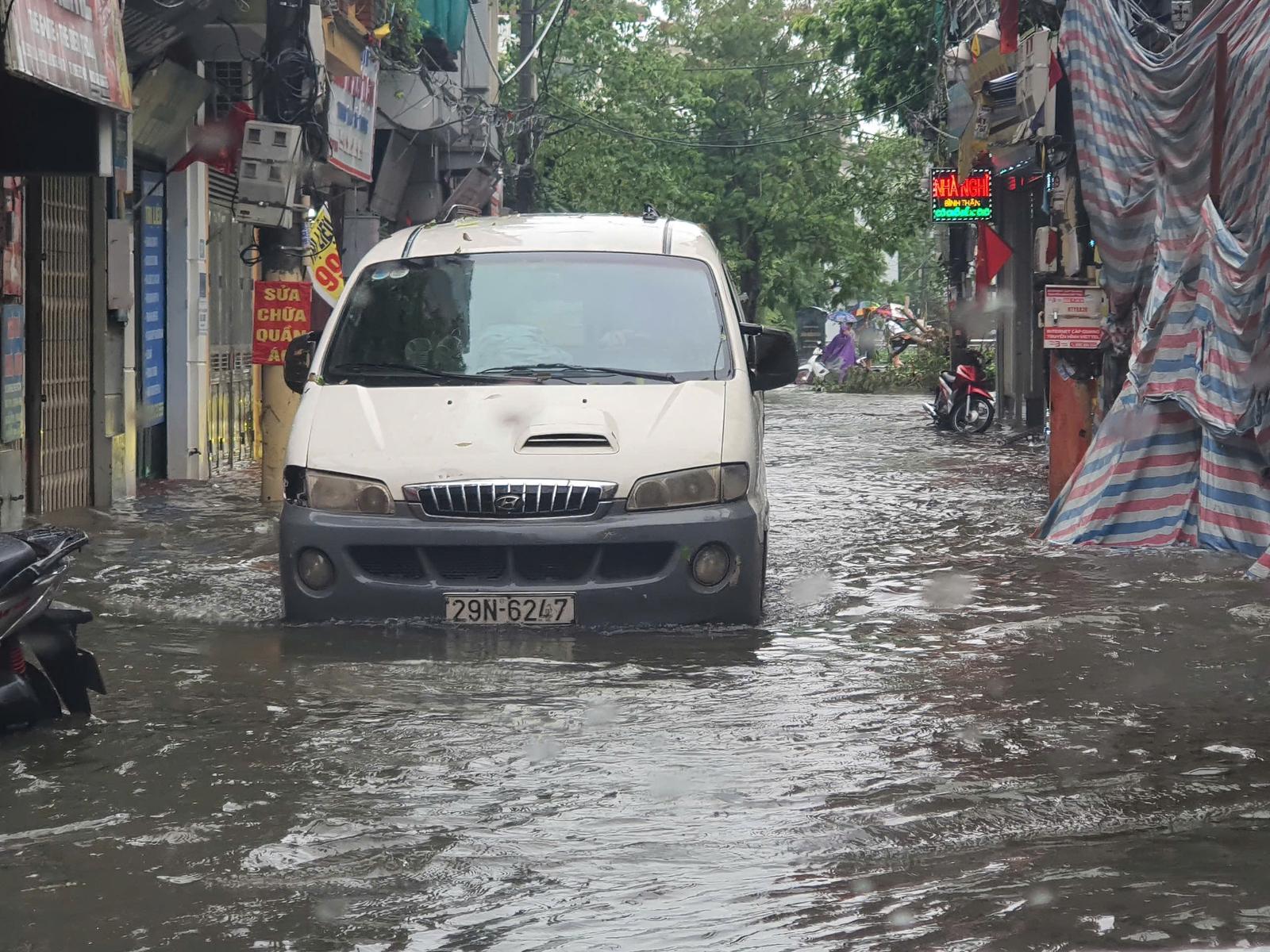 Đường Phùng Hưng, đoạn qua Bệnh viện 103 ngập sâu. Ảnh: HH