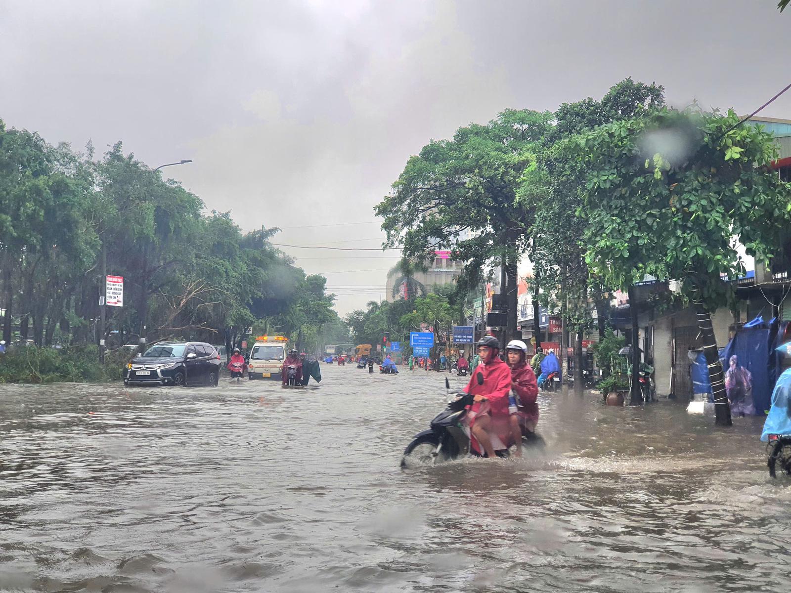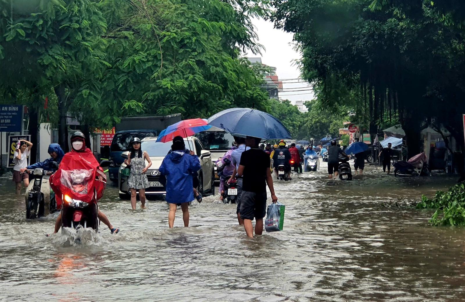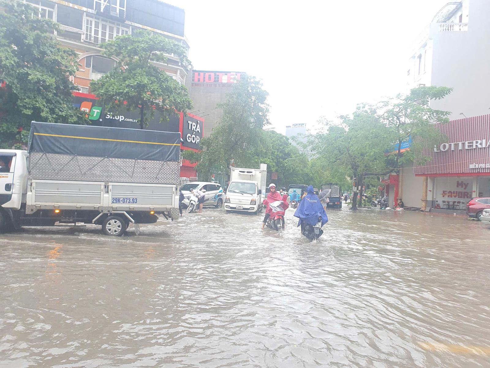 Đường Phùng Hưng, đoạn qua Bệnh viện 103 ngập sâu. Ảnh: HH