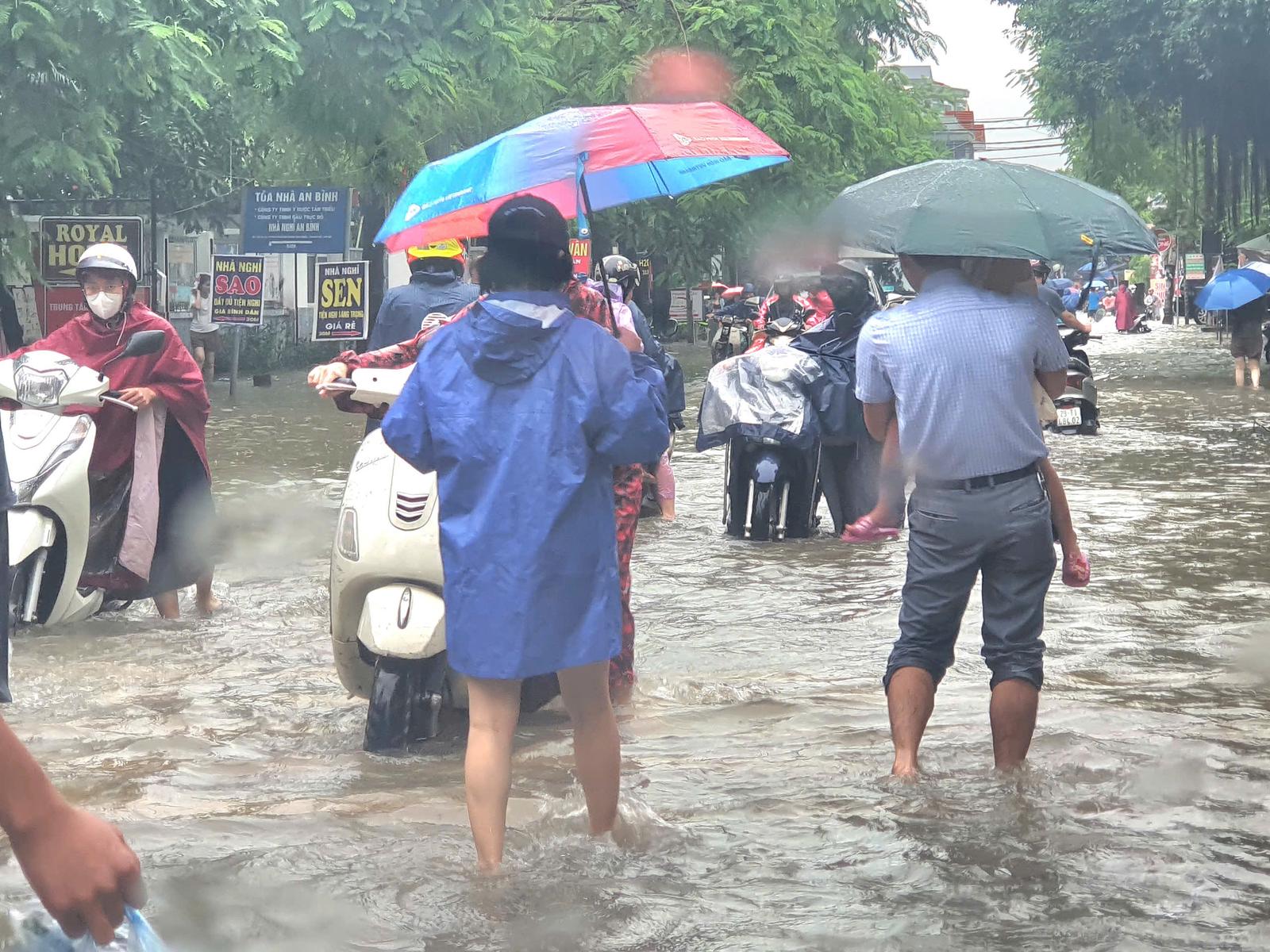 Anh Lê Văn Quân sống ở toà chung cư CT5, Yên Xá, Tân Triều, Thanh Trì chia sẻ: Anh phải ra khỏi ra lúc 6h30 phút để tránh cảnh ngập lụt làm tắc đường. Nhưng xung quanh toà nhà ngập tứ phía. Di chuyển rất khó khăn. Đã quen với cảnh này, nên anh quyết định vượt qua "biển nước". Tuy nhiên, càng đi càng thấy ngập sâu, đường Phùng Hưng, đoạn qua Bệnh viện 103, nhiều phương tiện phải chấp nhận quay đầu.