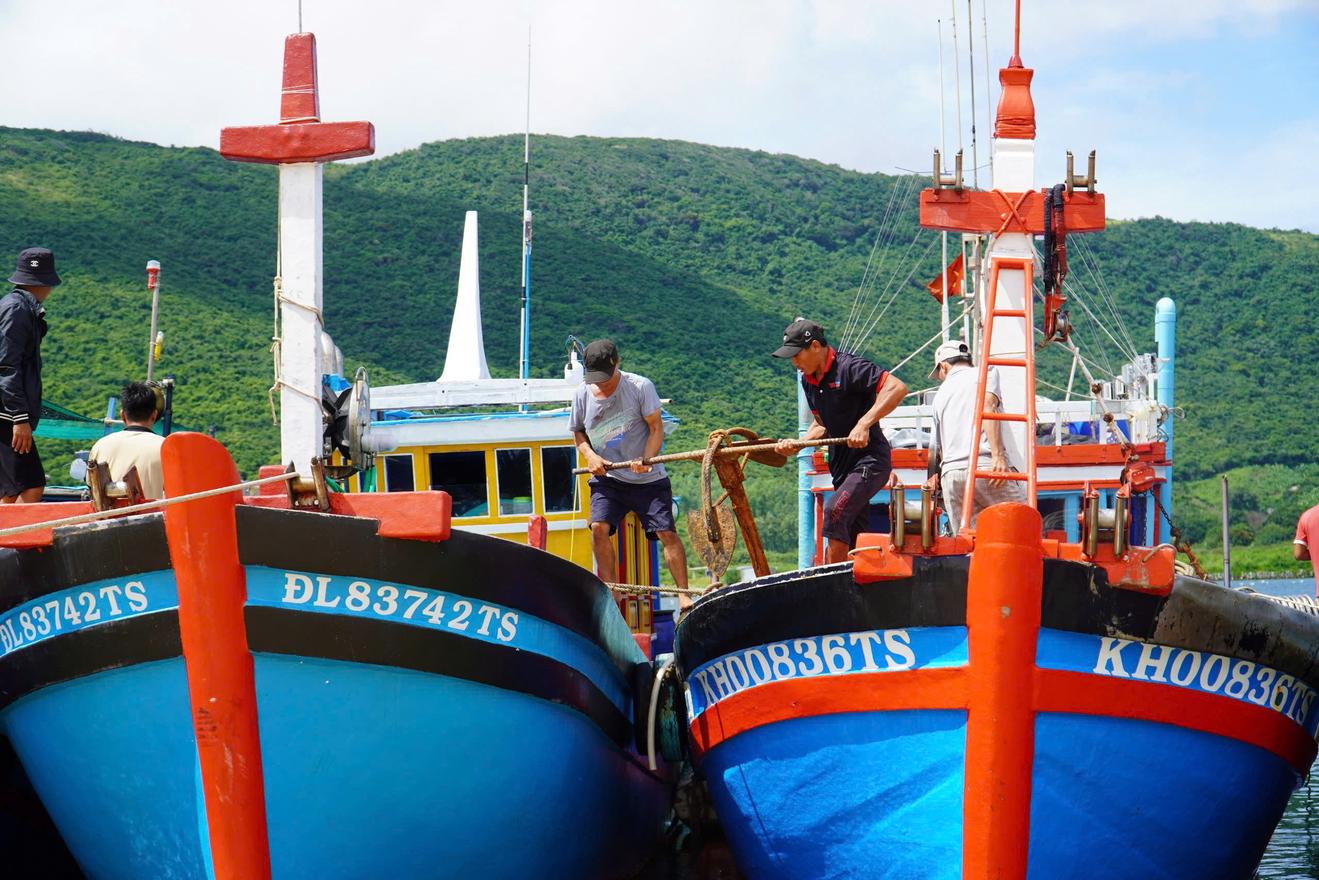 Ngư dân Khánh Hòa gia cố lại việc neo đầu tàu thuyền để tránh bão số 13. Ảnh: VT