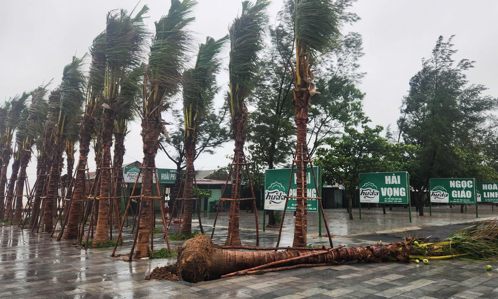 Một số cây xanh mới trồng tại bãi biển Cửa Việt cũng bị ngã do gió giật mạnh. Ảnh: Minh Tân