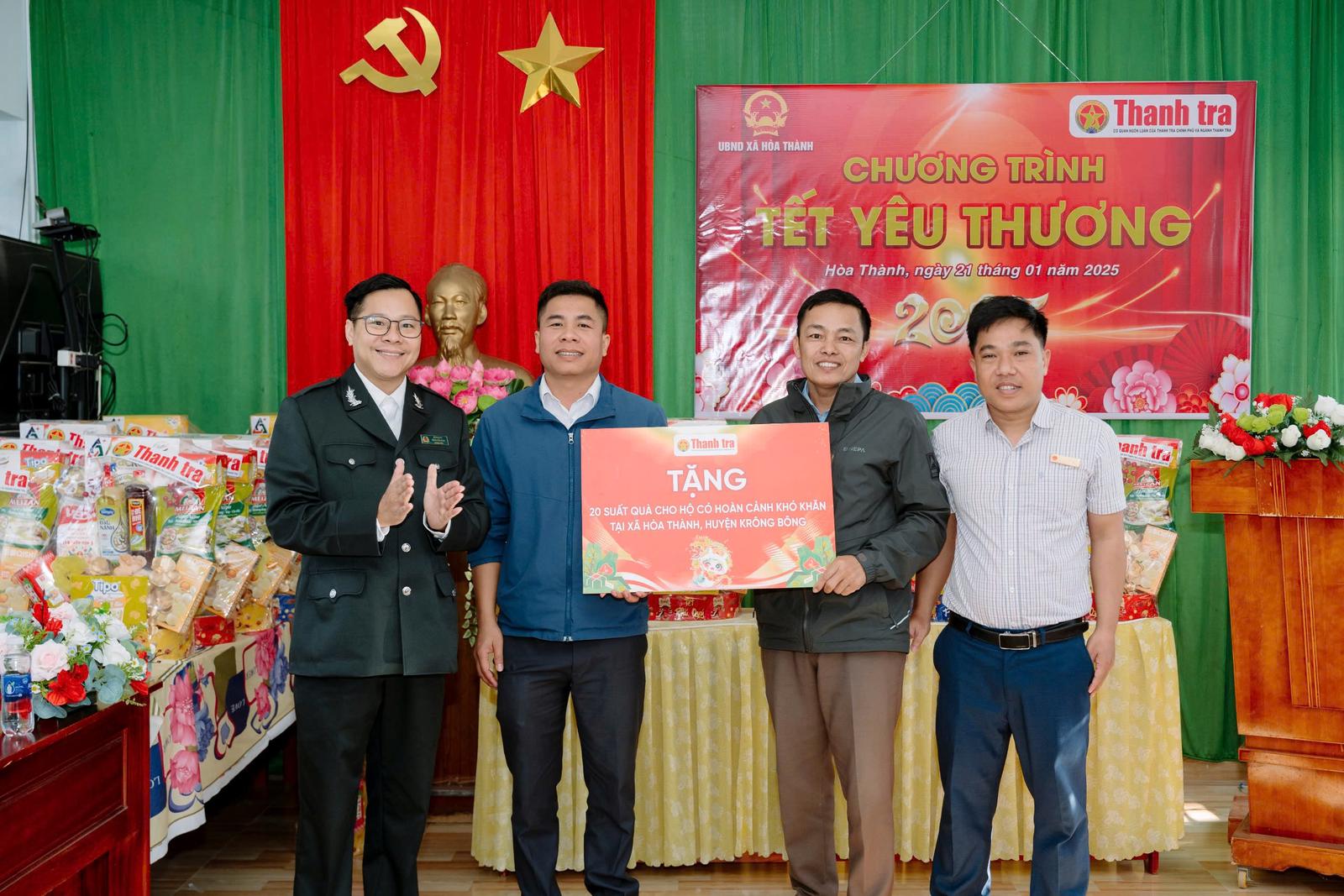 Nhân dịp Xuân Ất Tỵ 2025, Báo Thanh tra đã phối hợp với các đơn vị tổ chức 3 chương trình “Tết yêu thương” tại Đắk Lắk. Tại các chương trình, Báo Thanh tra và các đơn vị tài trợ đã trao tặng tổng cộng 154 suất quà với tổng giá trị trên 80 triệu đồng cho người dân huyện biên giới Ea Súp, huyện Krông Ana và huyện Krông Bông.