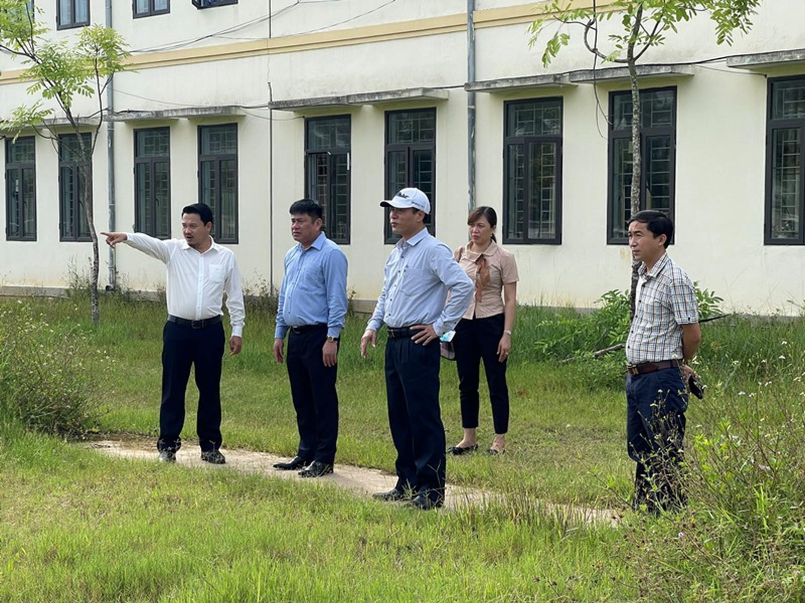 Khảo sát thực tế tại Trường THCS Nguyễn Tất Thành để sắp tới tiến hành xây dựng bể bơi nâng cao kỹ năng chống đuối nước cho học sinh. Ảnh: Chí Cường