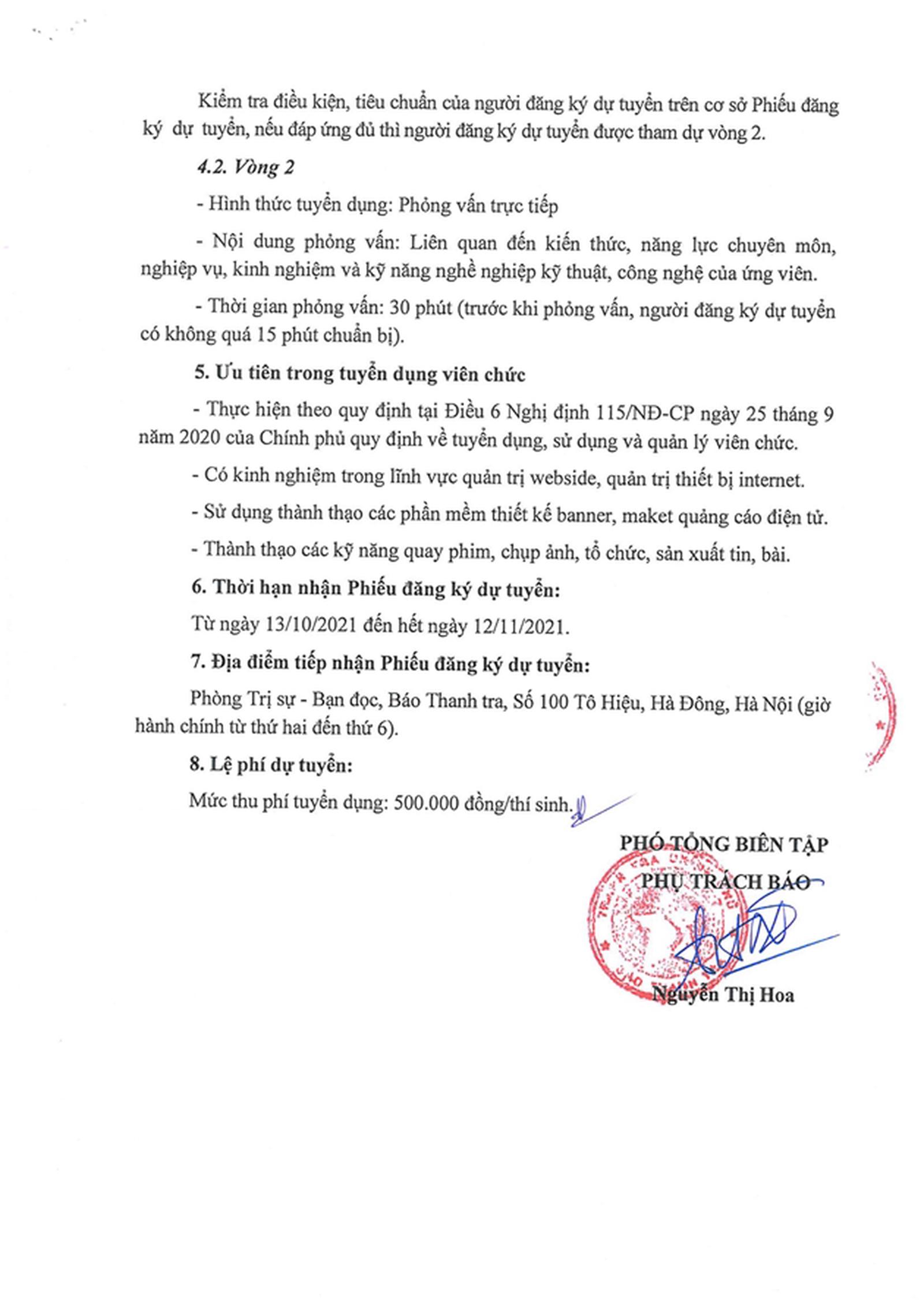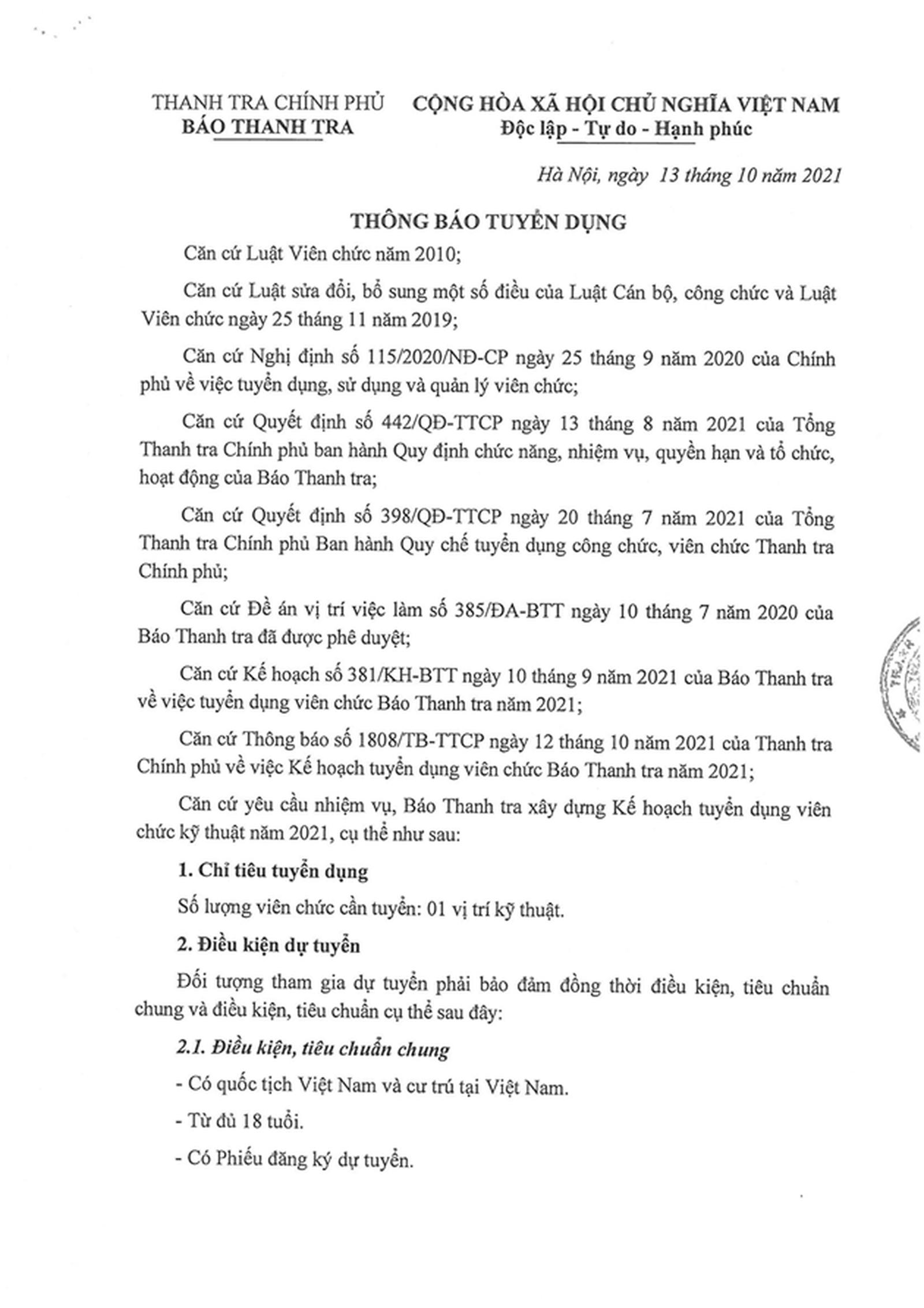 (Thanhtra) - Ngày 13/10/2021, Báo Thanh tra đã ra Thông báo Tuyển dụng 01 vị trí kỹ thuật.