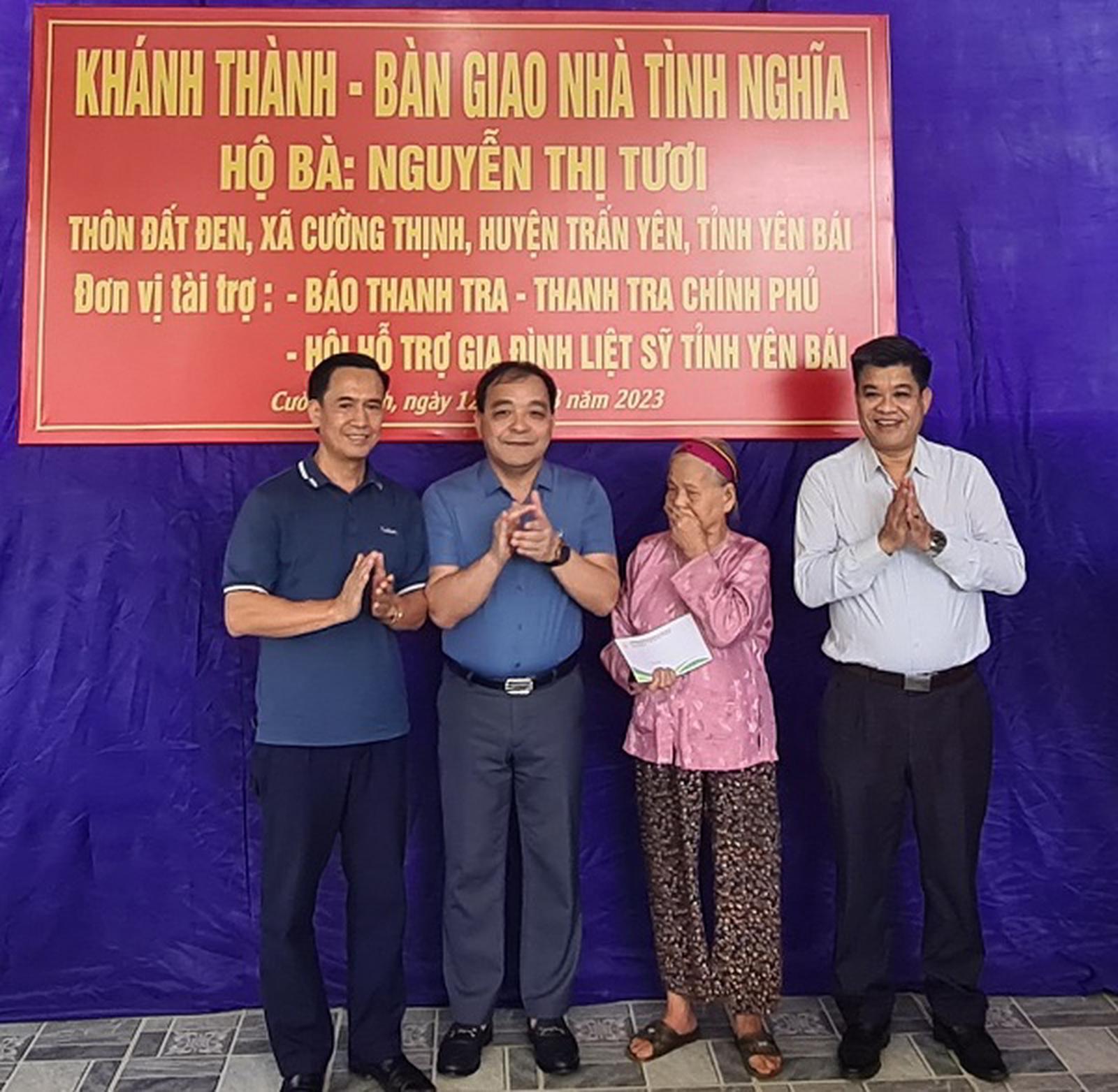 (Thanh tra) - Ngày 12/8/2023, Báo Thanh tra phối hợp với Hội Hỗ trợ gia đình liệt sỹ (HTGĐLS) tỉnh Yên Bái trao nhà tình nghĩa cho gia đình bà Nguyễn Thị Tươi, thân nhân liệt sỹ Hoàng Đình Khanh tại thôn Đất Đen, xã Cường Thịnh, huyện Trấn Yên, tỉnh Yên Bái. Đây là căn nhà đầu tiên trong 12 căn mà Báo Thanh tra thực hiện trao tặng thân nhân liệt sỹ tại tỉnh Yên Bái.