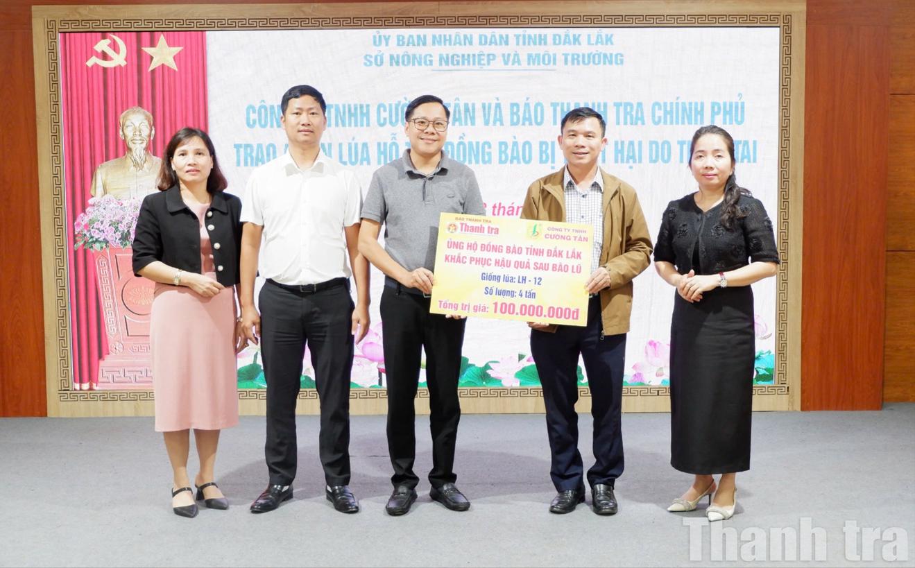 Trước thực tế khó khăn đó, Báo Thanh tra đã chủ động kết nối các doanh nghiệp, vận động nguồn lực xã hội hóa nhằm kịp thời sẻ chia với người dân vùng thiên tai. Tại buổi tiếp nhận ngày 8/12, Báo Thanh tra cùng Công ty TNHH Cường Tân và Trường Cao đẳng Công nghệ Y - Dược Việt Nam đã trao tặng 4 tấn lúa giống (trị giá 100 triệu đồng) thông qua Sở Nông nghiệp và Môi trường tỉnh Đắk Lắk.