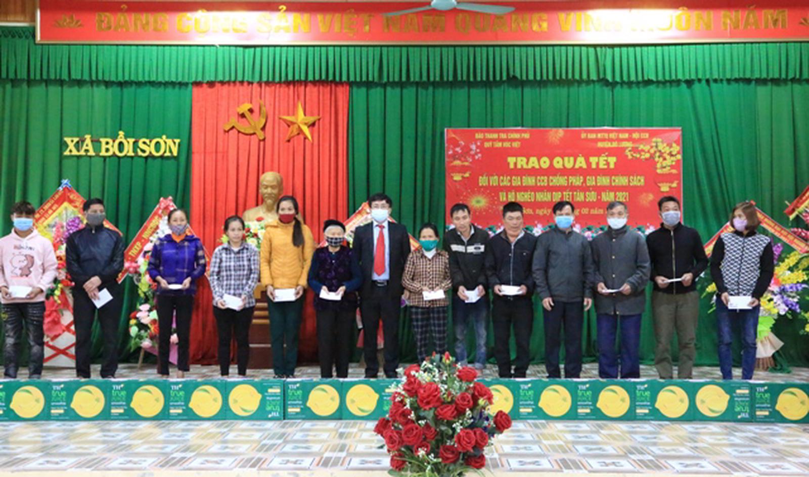 Tại xã Bồi Sơn, ông Trần Đăng Vinh, quyền Vụ trưởng phụ trách Báo Thanh tra cùng lãnh đạo địa phương đã trao tặng 60 phần quà (mỗi phần quà trị giá 500 ngàn đồng tiền mặt và 1 thùng sữa TH TrueMilk) cho các gia đình CCB chống Pháp, các gia đình chính sách và hộ nghèo ở xã Bồi Sơn, huyện Đô Lương.