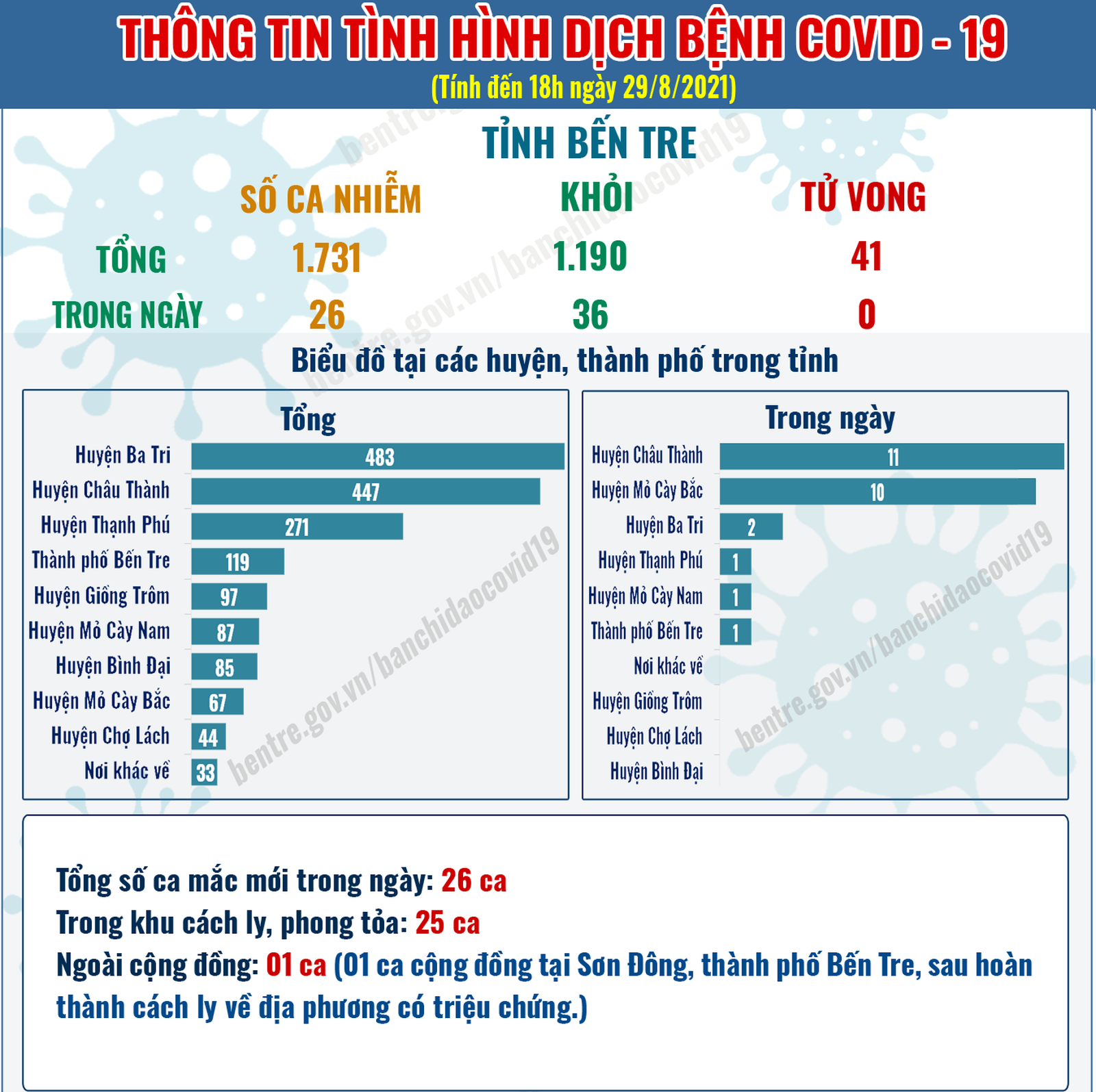 Ngày 29/8, toàn tỉnh Bến Tre ghi nhận 26 ca nhiễm Covid-19 mới. Ảnh: bentre.gov.vn