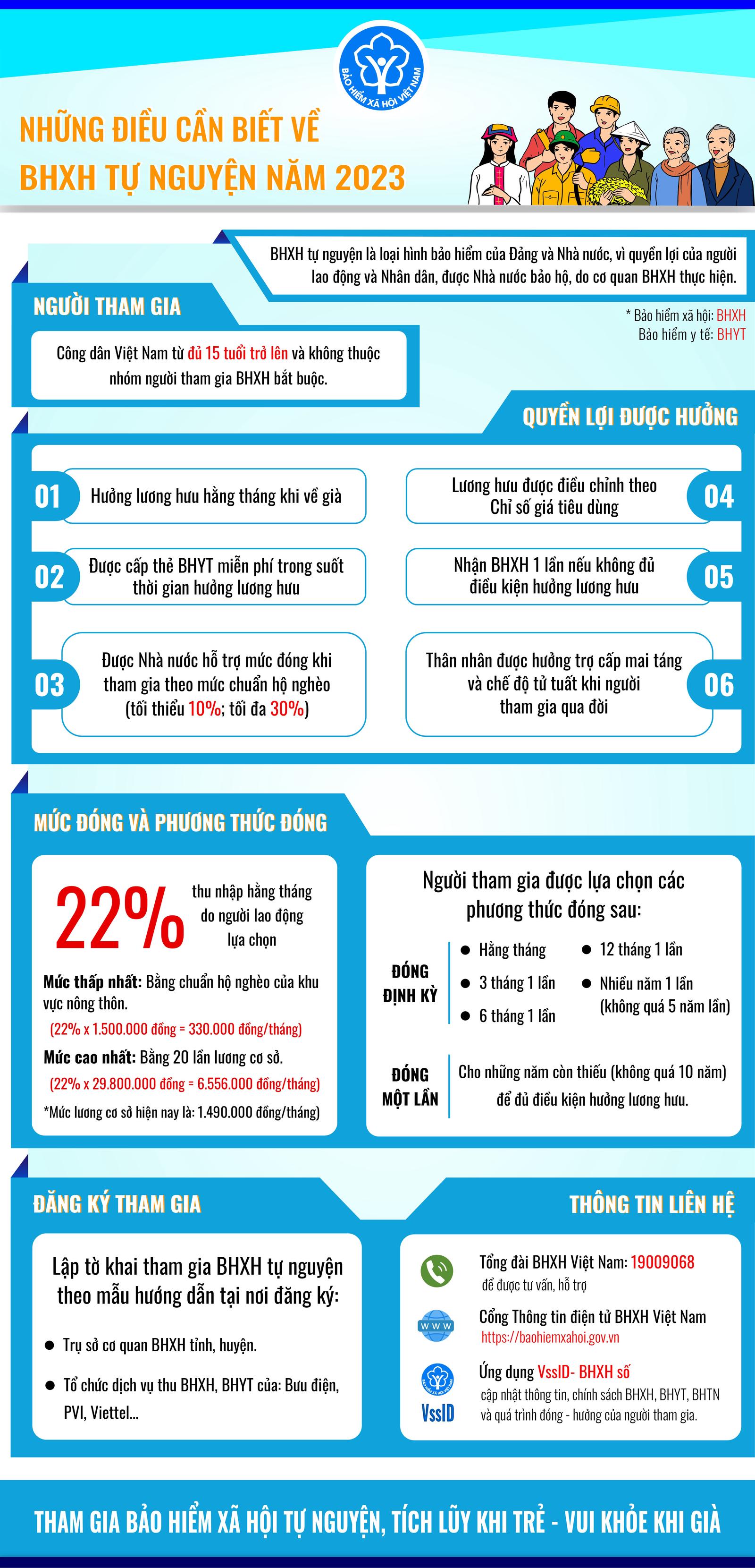 Trong đó, người dân tham gia BHXH tự nguyện có cơ hội được hưởng lương hưu hàng tháng và được cấp thẻ bảo hiểm y tế miễn phí để đảm bảo cuộc sống và chăm sóc sức khỏe khi hết tuổi lao động; người thân được nhận chế độ tử tuất khi chẳng may người tham gia qua đời..