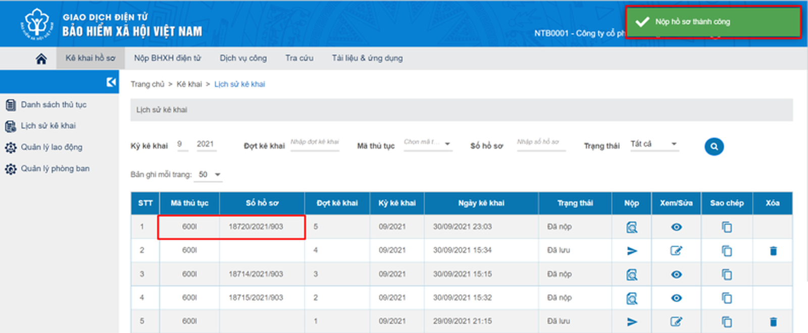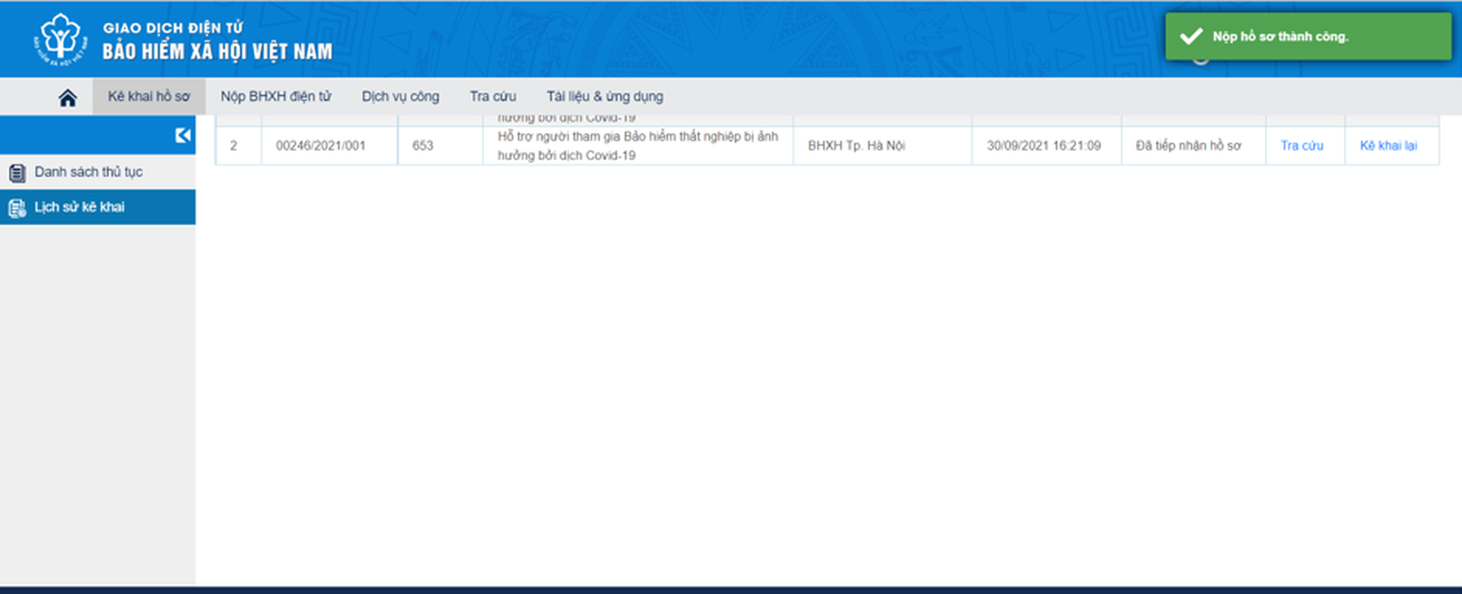 Sau khi thực hiện xác nhận thành công, hệ thống sẽ thông báo nộp hồ sơ thành công. Như vậy là hồ sơ của NLĐ đã được gửi đến cơ quan BHXH thành công.