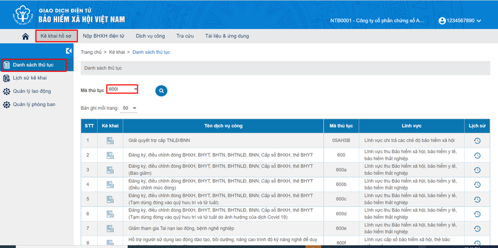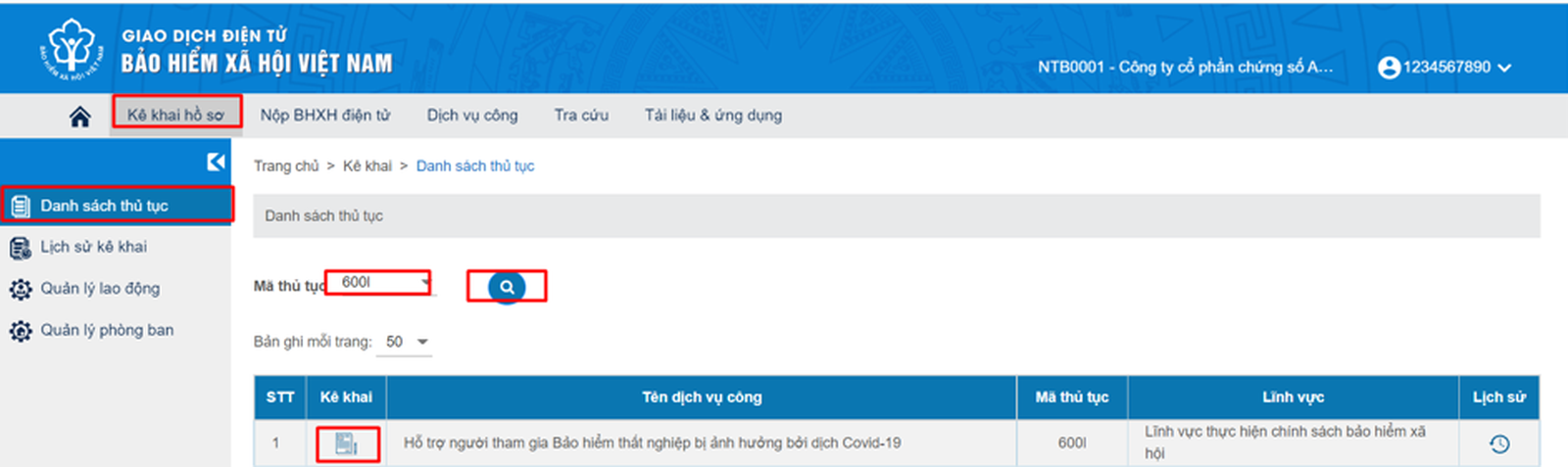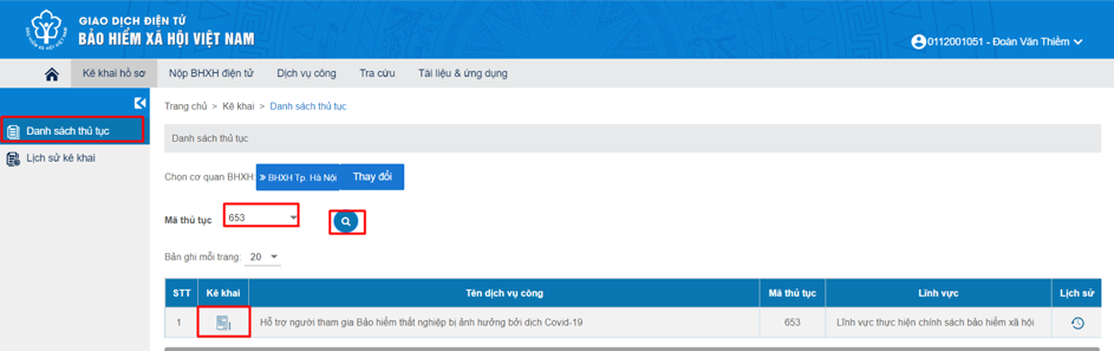 Bước 3: Tại màn hình: “Danh sách thủ tục”, chọn mã thủ tục “653 - Hỗ trợ người tham gia BHTN bị ảnh hưởng bởi dịch Covid-19” và chọn Kê khai.