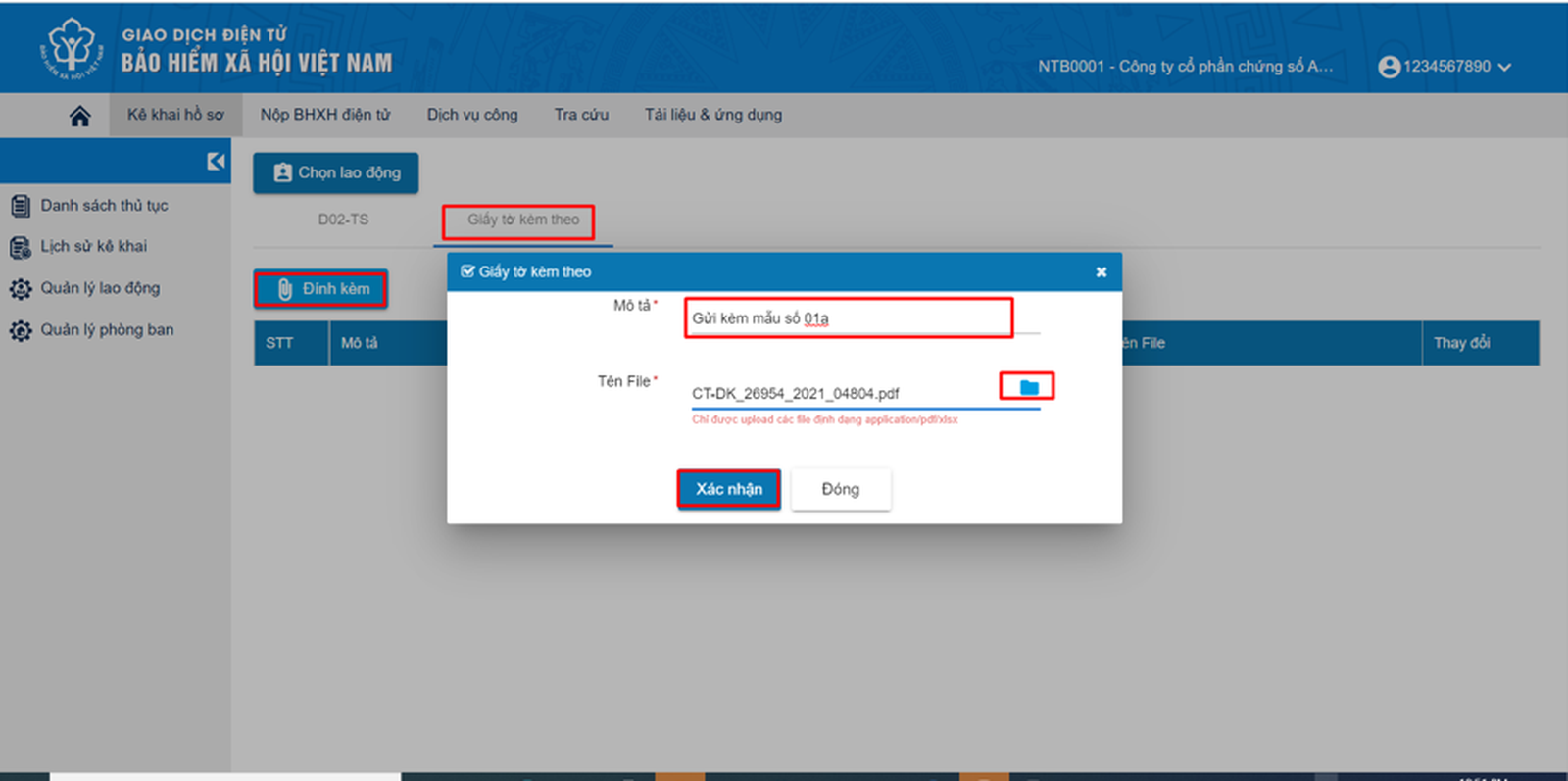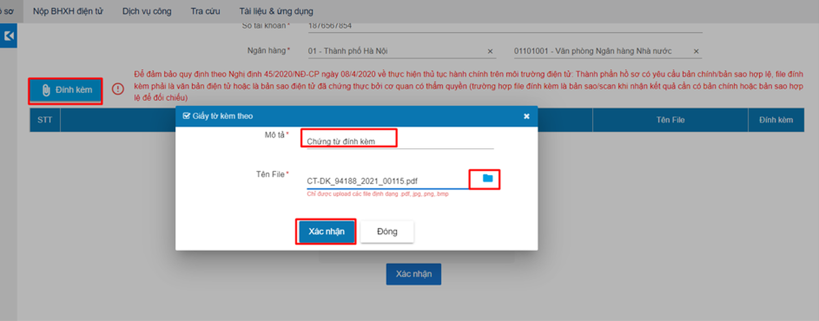 Bước 5: Thực hiện gửi kèm mẫu số 01 như hình sau và chọn Xác nhận.