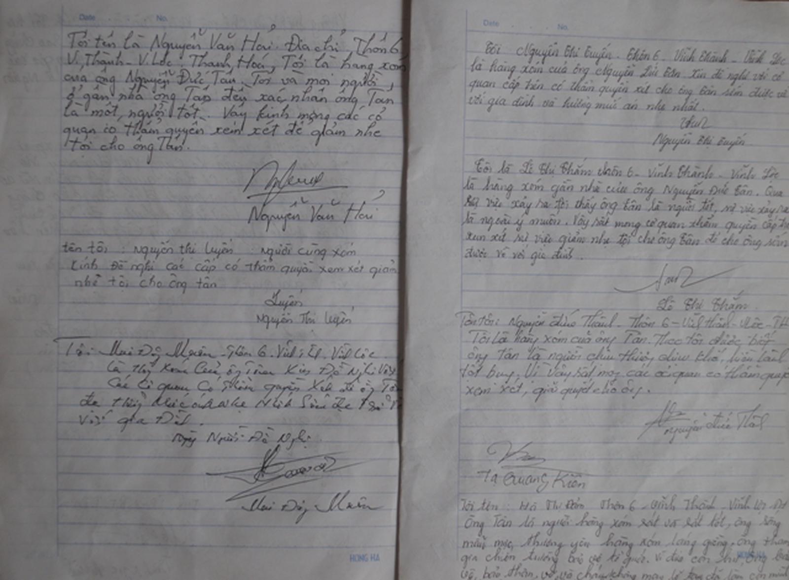 Lá đơn xin bãi nại được người dân ký xin giảm nhẹ tội cho ông Tân. Ảnh: Văn Thanh