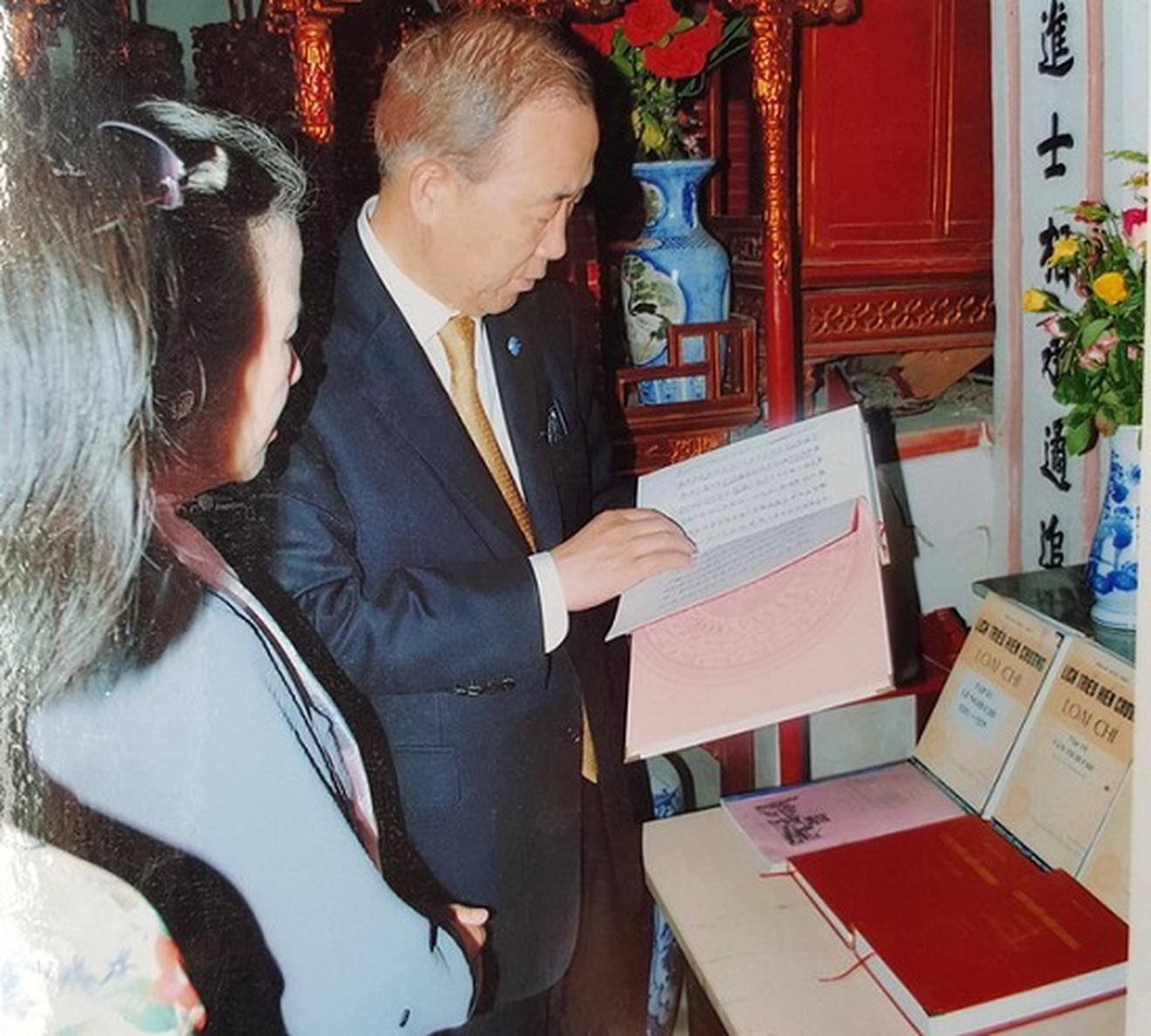 Ông Ban Ki-moon và vợ xem những cuốn sách liên quan đến dòng họ Phan Huy tại nhà thờ. Ảnh gia đình cung cấp