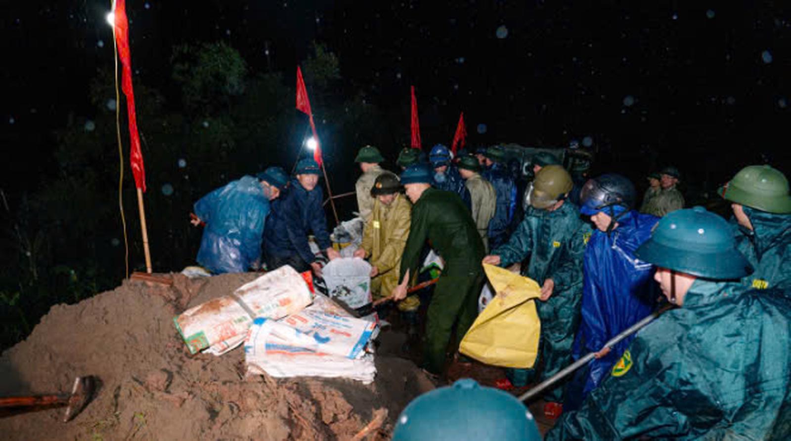 Lực lượng phòng, chống bão lũ của địa phương đang gia cố thân đê khu vực đê Hữu Hồng, xã Tiến Thắng. Ảnh: Báo Hà Nam