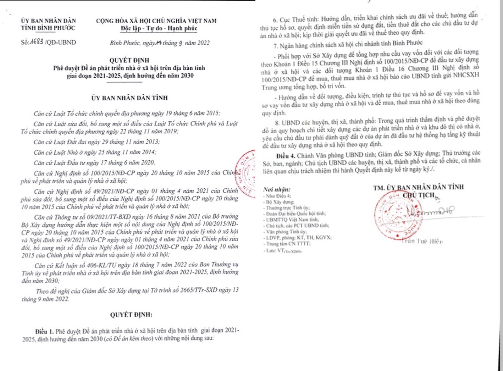 Theo Đề án Phát triển nhà ở xã hội của tỉnh giai đoạn 2021-2025, định hướng đến năm 2030 vừa được UBND tỉnh Bình Phước phê duyệt, thì có hơn 156.000 người có nhu cầu nhà ở xã hội. Giai đoạn 2022-2030, tỉnh sẽ triển khai thực hiện 18 dự án nhà ở xã hội cho công nhân với diện tích khoảng 173ha, tập trung ở các địa bàn Đồng Xoài (2 dự án), Chơn Thành (4 dự án), Đồng Phú (9 dự án), Hớn Quản (2 dự án), Lộc Ninh (1 dự án).