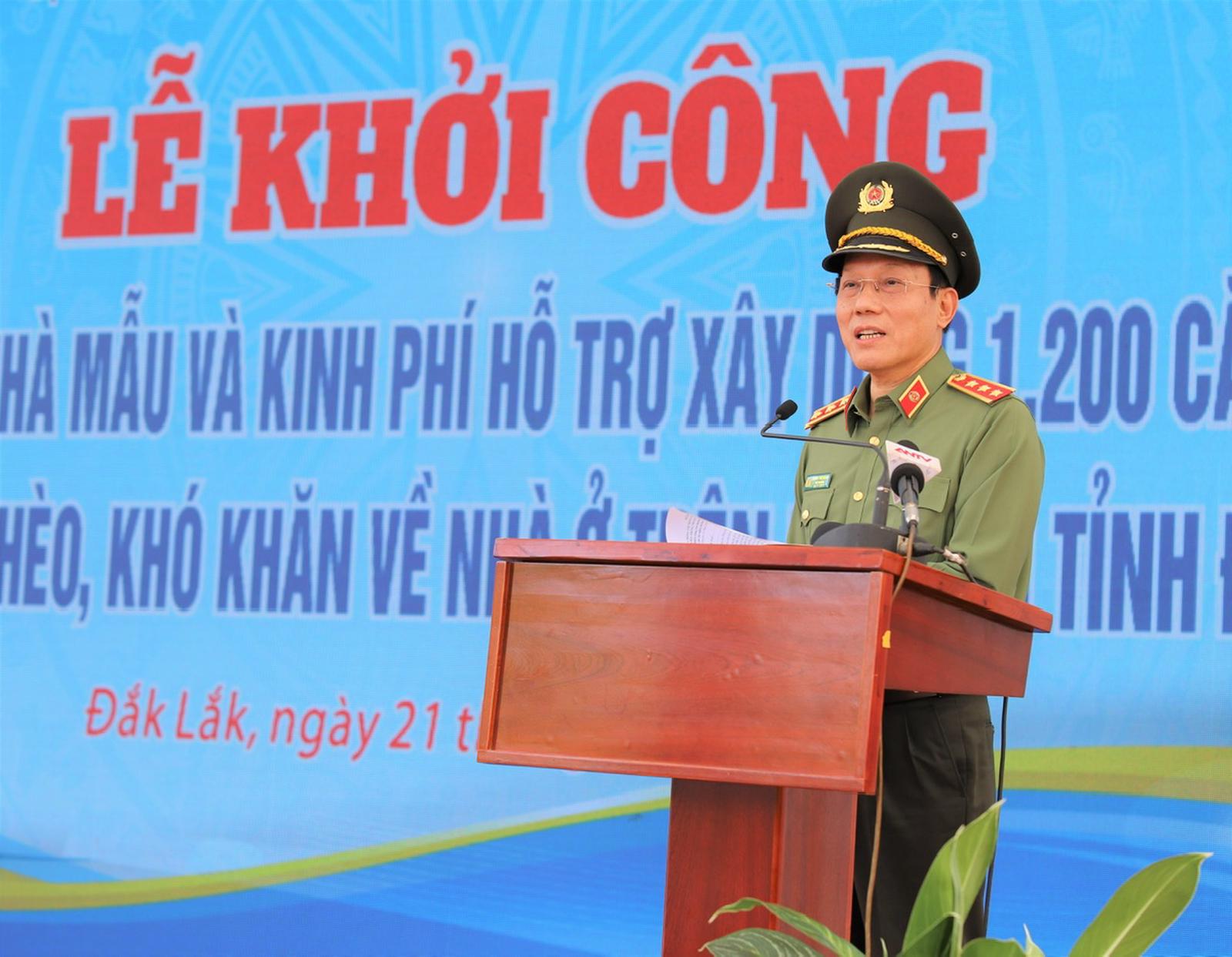 Dự và phát biểu tại buổi lễ, Thượng tướng Lương Tam Quang - Thứ trưởng Bộ Công an, cảm ơn các nhà tài trợ đã đồng hành hỗ trợ kinh phí triển khai xây dựng nhà trao tặng các hộ nghèo tại tỉnh Đắk Lắk.