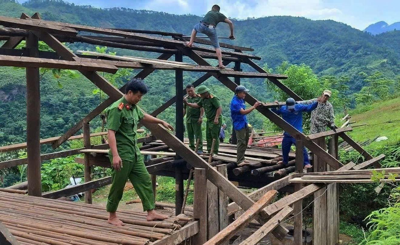 Công an xã Minh Sơn, tỉnh Tuyên Quang cùng người dân tháo dỡ nhà tạm để xây dụng mới. Ảnh: TT
