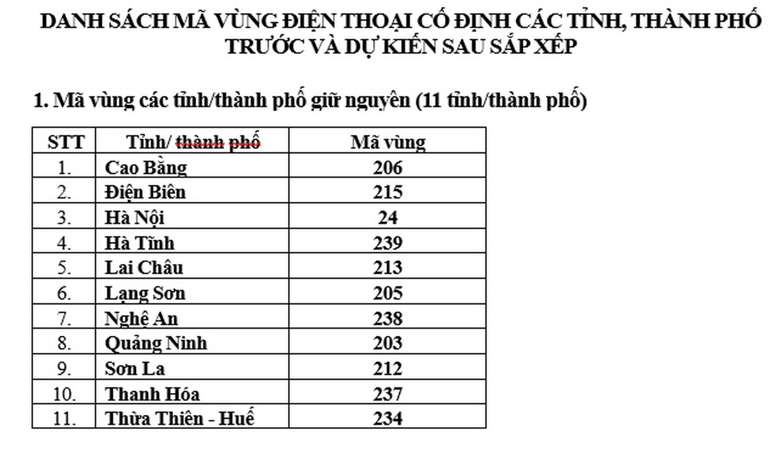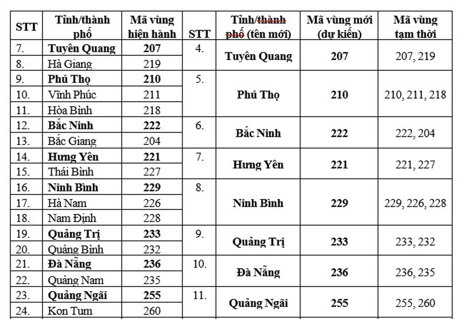 Mã vùng điện thoại cố định của 23 tỉnh/thành phố mới được sắp xếp từ 2 tỉnh/thành phố trở lên, bao gồm: Tuyên Quang, Lào Cai, Thái Nguyên, Phú Thọ, Bắc Ninh, Hưng Yên, Hải Phòng, Ninh Bình, Quảng Trị, Đà Nẵng, Quảng Ngãi, Gia Lai, Khánh Hòa, Lâm Đồng, Đăk Lắk, Thành phố Hồ Chí Minh, Đồng Nai, Tây Ninh, Cần Thơ, Vĩnh Long, Đồng Tháp, Cà Mau, An Giang.