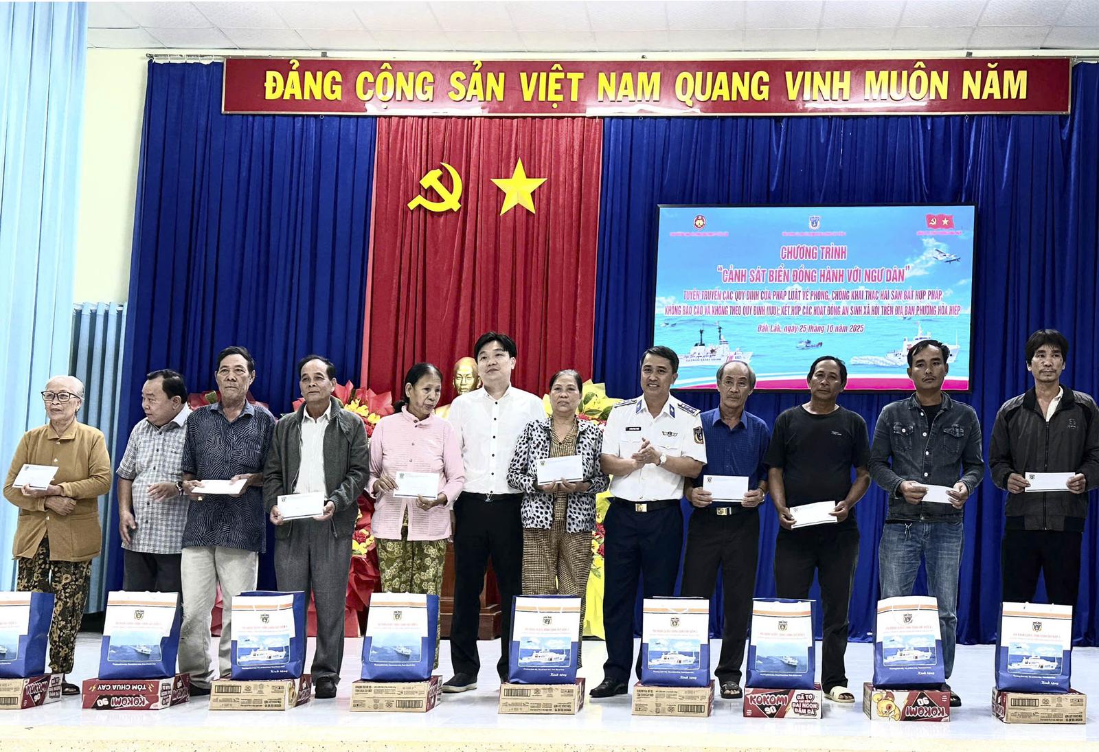 (Thanh tra) - Ngày 25/10, Hải đoàn 32, Bộ Tư lệnh Vùng Cảnh sát biển 3 đã phối hợp với Ban Tuyên giáo và Dân vận Tỉnh ủy Đắk Lắk, UBND phường Hoà Hiệp, Chi đội Kiểm ngư Số 4, Đồn Biên phòng Hòa Hiệp Nam và Phòng khám Đa khoa quốc tế Việt Hàn tổ chức Chương trình “Cảnh sát biển đồng hành với ngư dân” tại phường Hoà Hiệp.