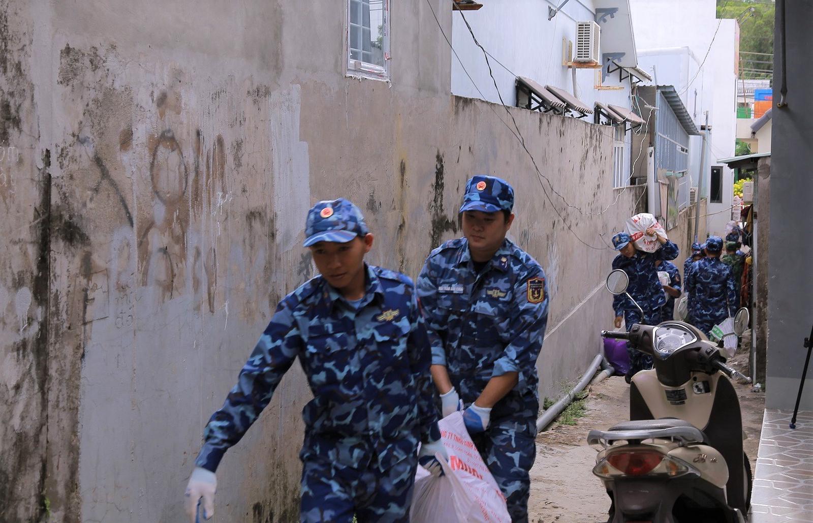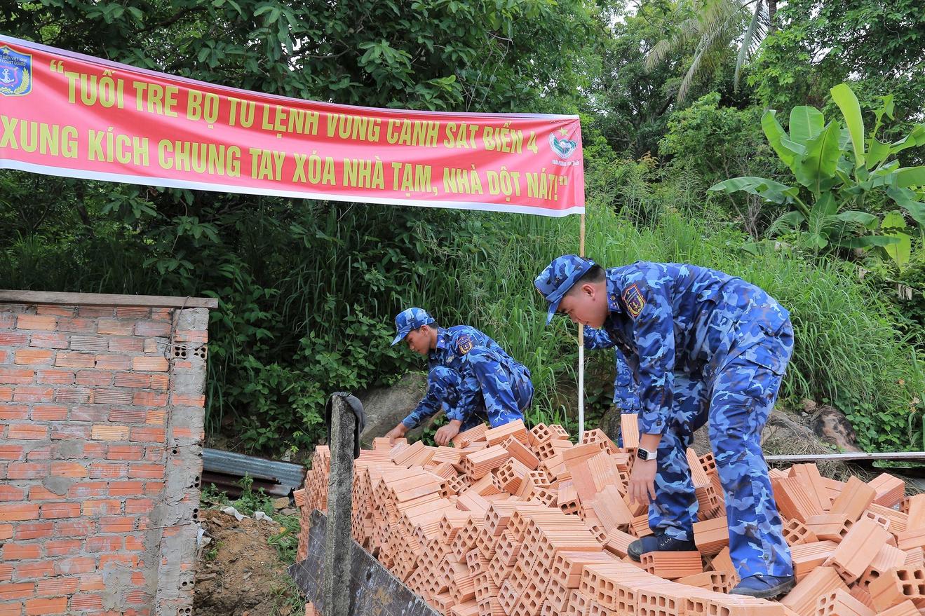 Cán bộ, đoàn viên, hội viên BTL Vùng Cảnh sát biển 4 tham gia vận chuyển vật liệu xây dựng, hỗ trợ gia đình ông Nguyễn Văn Nâu. Ảnh: A.X
