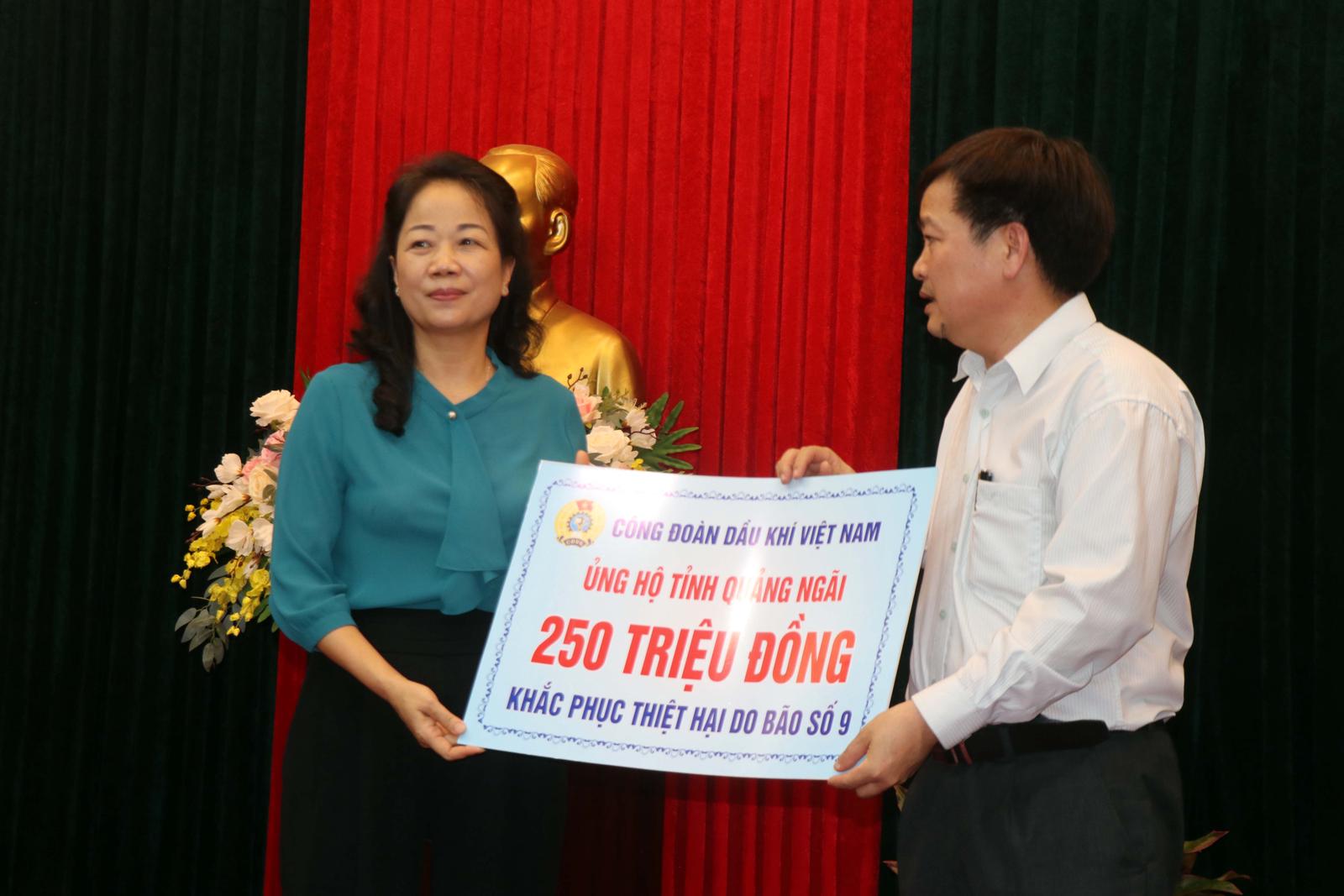 Bà Khuất Thị Lê - Chủ tịch Công đoàn Cơ sở BSR thừa ủy quyền của Công đoàn Dầu khí Việt Nam cũng trao biển tượng trưng hỗ trợ 250 triệu đồng cho tỉnh Quảng Ngãi khắc phục thiệt hại do bão số 9.