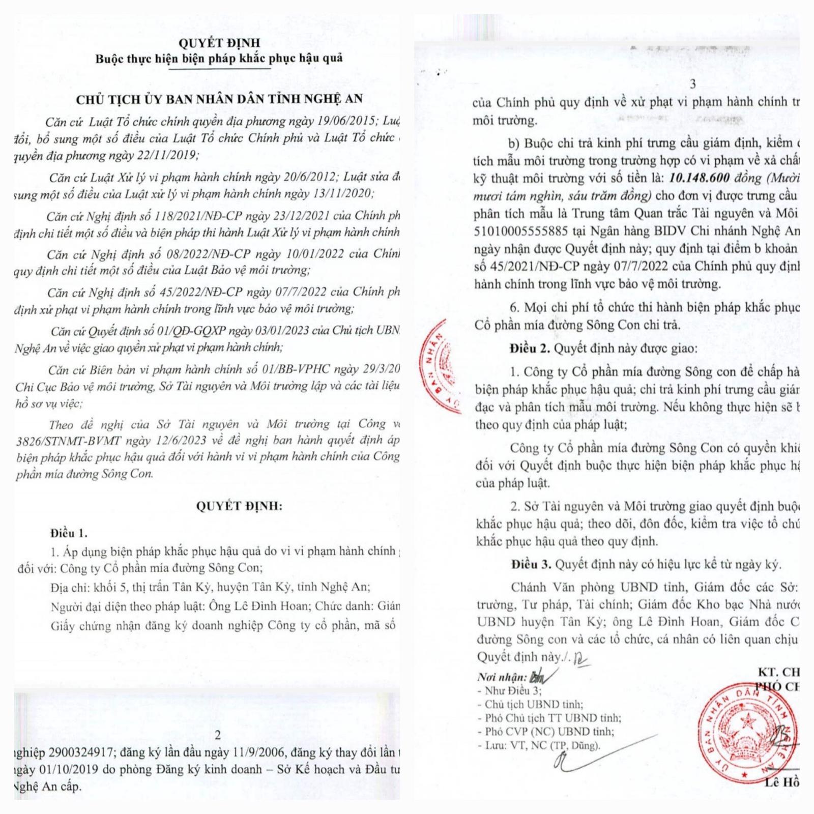 Ông Lê Hồng Vinh, Phó Chủ tịch Thường trực UBND tỉnh Nghệ An đã ký ban hành Quyết định 170/QĐ-XPHC về việc buộc thực hiện biện pháp khắc phục hậu quả đối với Cty Mía đường Sông Con, địa chỉ khối 5, thị trấn Tân Kỳ, huyện Tân Kỳ.