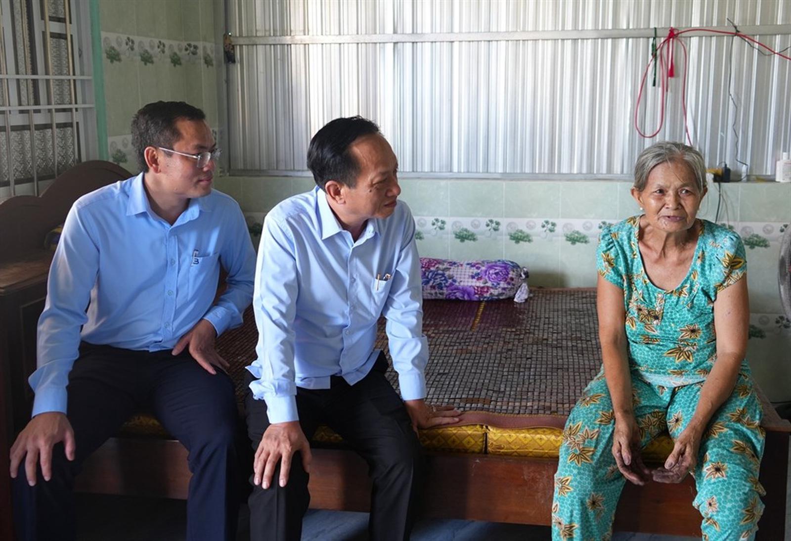Chủ tịch HĐND tỉnh Phạm Văn Thiều (thứ hai từ trái sang) cùng Phó Chủ tịch UBND tỉnh Ngô Vũ Thăng (ngồi bìa trái) thăm hỏi, động viên hộ gia đình bà Cao Thị Xíu, ấp Thạnh Hưng 2, xã Châu Thới. Ảnh: Trúc Đào