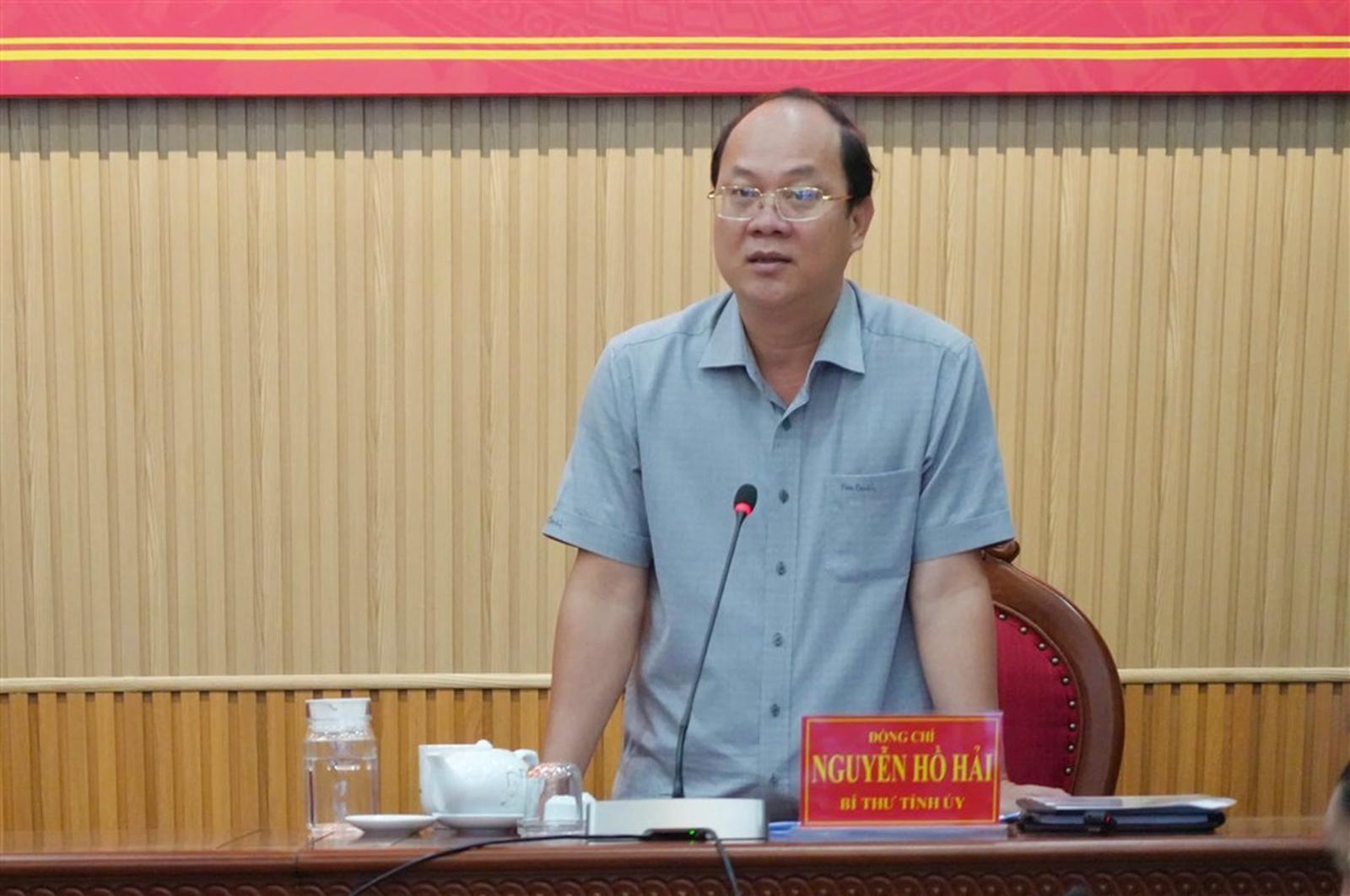 Bí thư Tỉnh ủy Nguyễn Hồ Hải phát biểu tại cuộc họp ngày 9/7 với Đoàn công tác kiểm tra tình hình xóa nhà tạm, nhà dột nát tại địa bàn các xã, phường tỉnh Cà Mau. Ảnh: Mỹ Trân