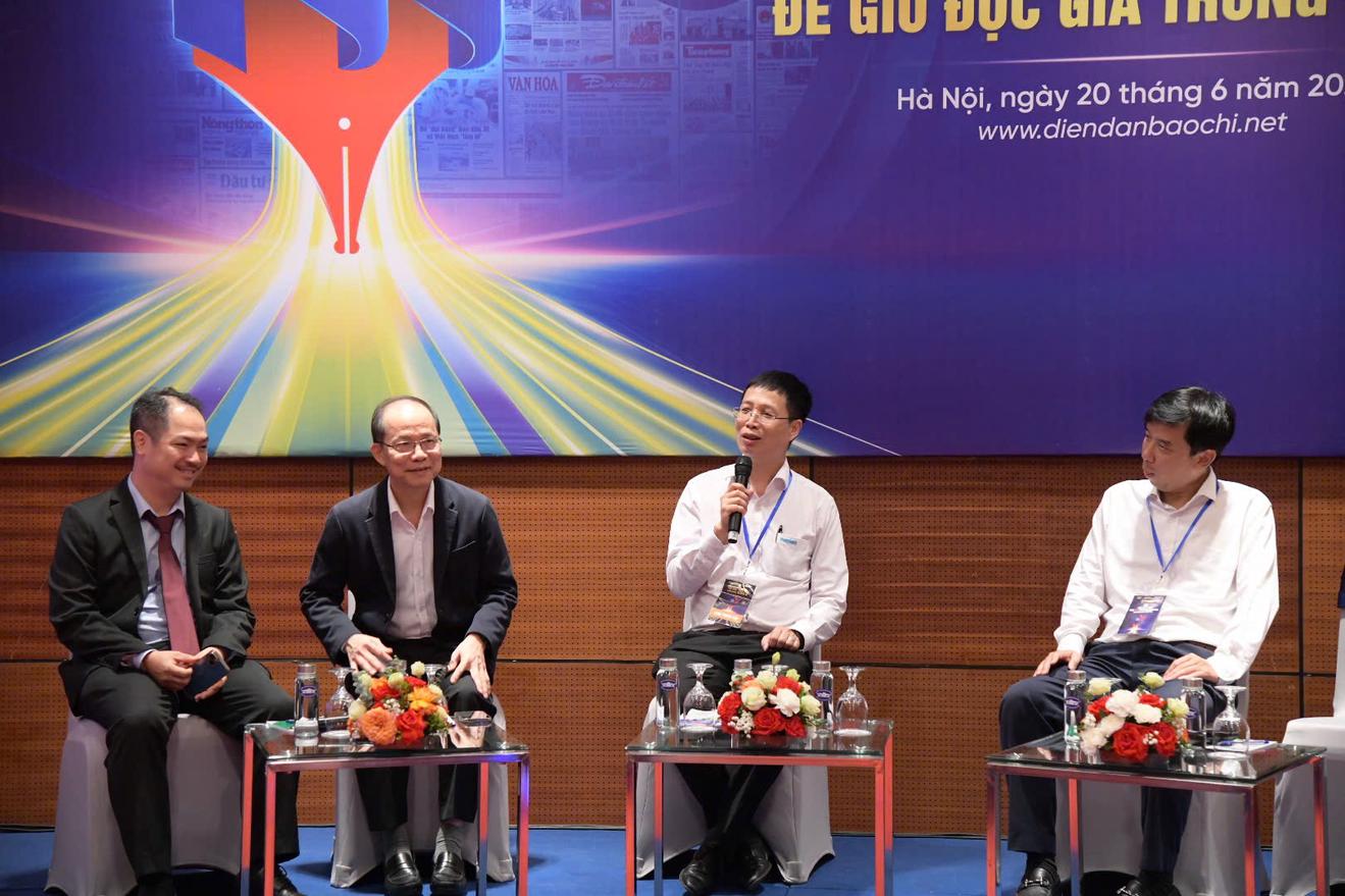 Phiên thảo luận quy tụ nhiều lãnh đạo các báo điện tử lớn như ông Ngô Văn Hải, Tổng Biên tập Báo VTC News; ông Nguyễn Trường Sơn, Tổng Biên tập Báo Thế Giới và Việt Nam; ông Lê Xuân Trung, Phó Tổng Biên tập Báo Tuổi Trẻ; cùng ông Bùi Trung Hiếu, chuyên gia công nghệ thông tin thuộc Công ty TNHH Giải pháp phần mềm MFITE. Ảnh: Huy Trần