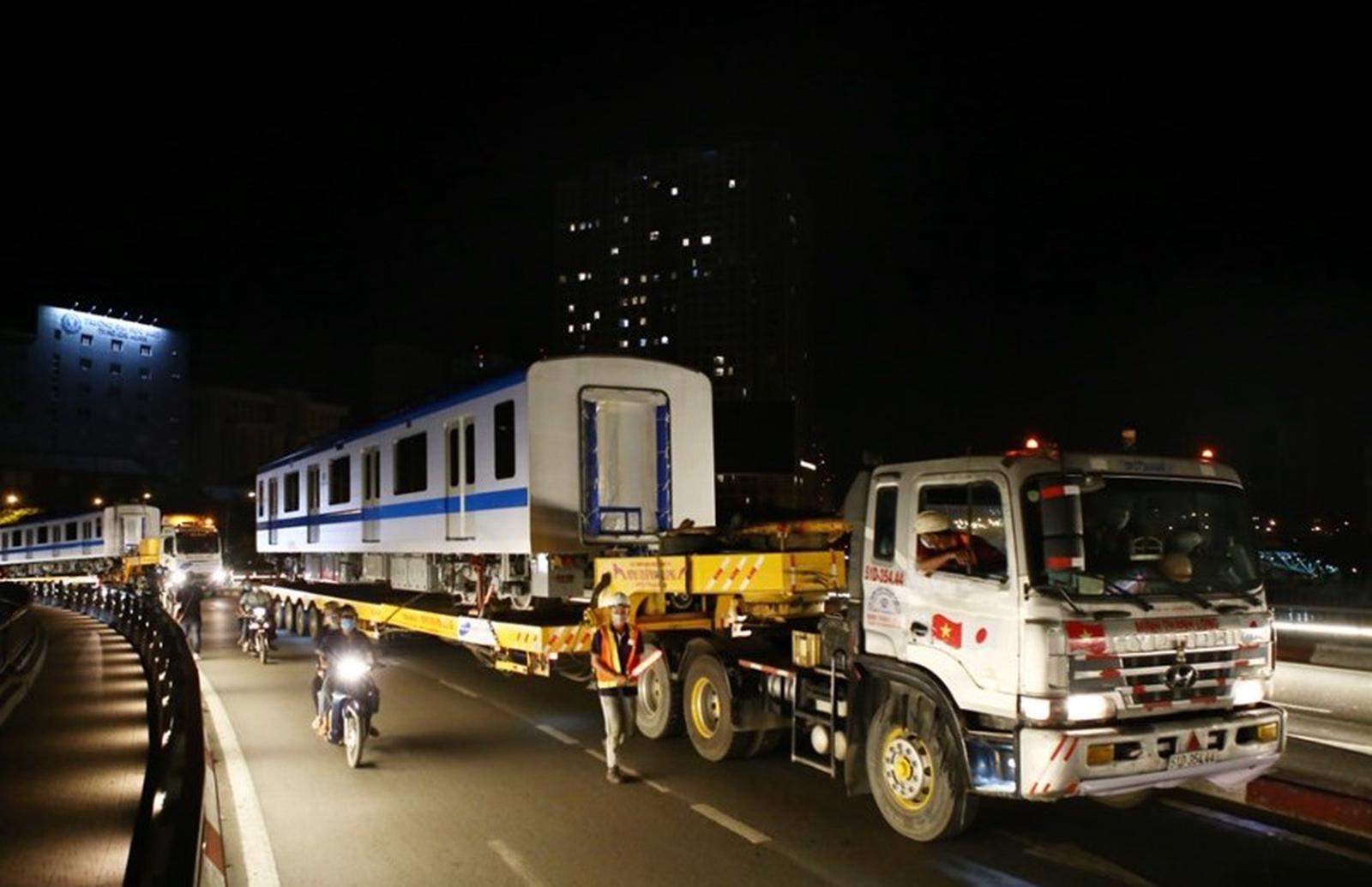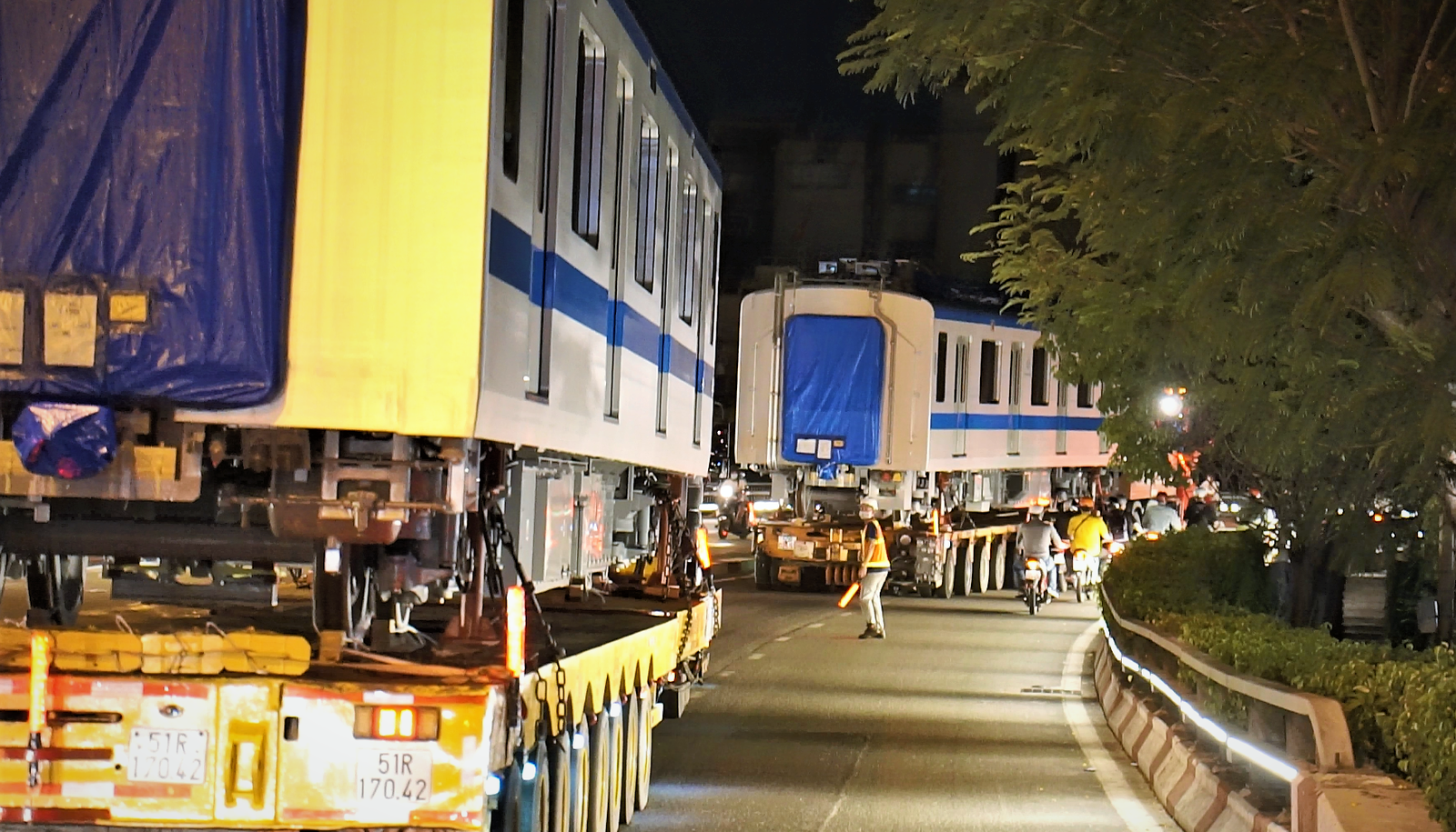 Các toa tàu được dỡ xuống bến cảng Khánh Hội (quận 4, TP HCM) vào trưa 10/5, đến 0h ngày 11/5, các toa tàu thuộc đoàn tàu số 2 bắt đầu được vận chuyển bằng đoàn "xe khủng" để đến khu vực depot Long Bình (TP Thủ Đức) vận hành thử nghiệm, với chặng đường dài 26km.