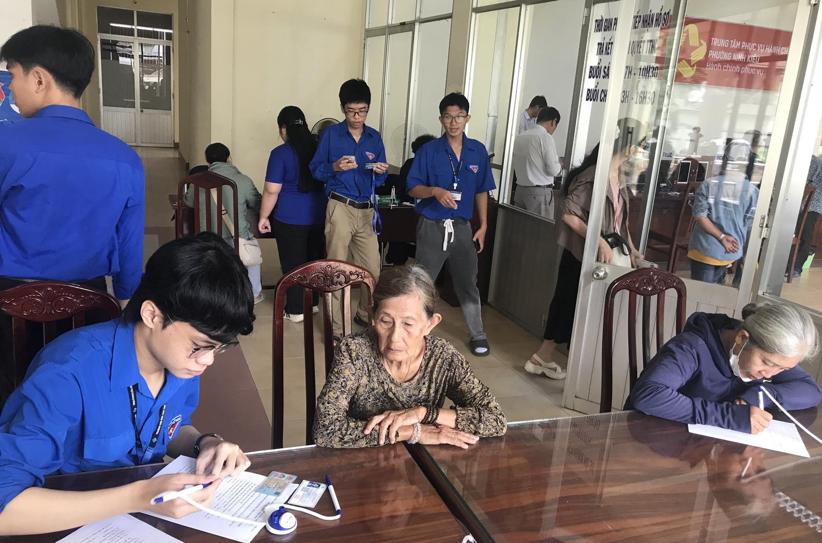 Đoàn viên thanh niên Đại học Cần Thơ hỗ trợ người dân kê khai tại Trung tâm Phục vụ hành chính công phường Ninh Kiều. Ảnh: V.A