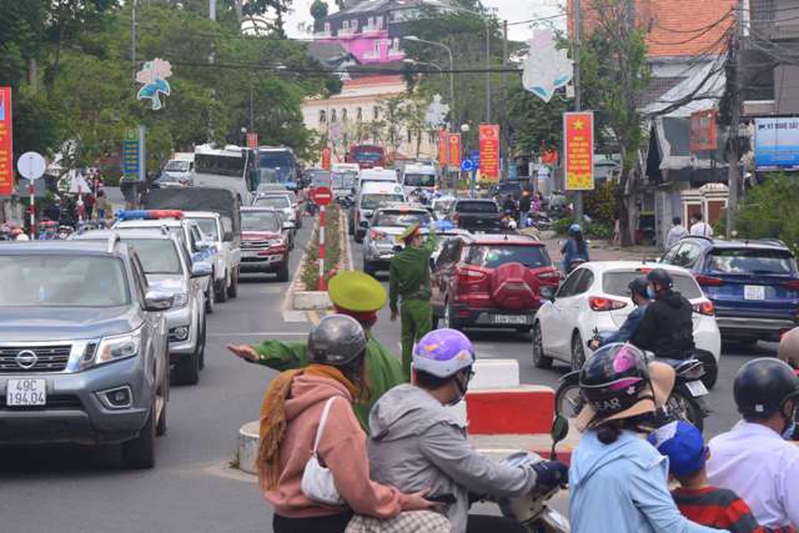 Du khách bắt đầu đổ về TP Đà Lạt từ tối ngày 30/4, hàng ngàn phương tiện nối đuôi nhau lưu thông vào hướng nội đô. Đặc biệt, vào giờ cao điểm, các nút giao thông tại cửa ngõ vào trung tâm Đà Lạt luôn trong tình trạng quá tải, khiến lực lượng chức năng phải căng mình phân luồng trong nhiều giờ.