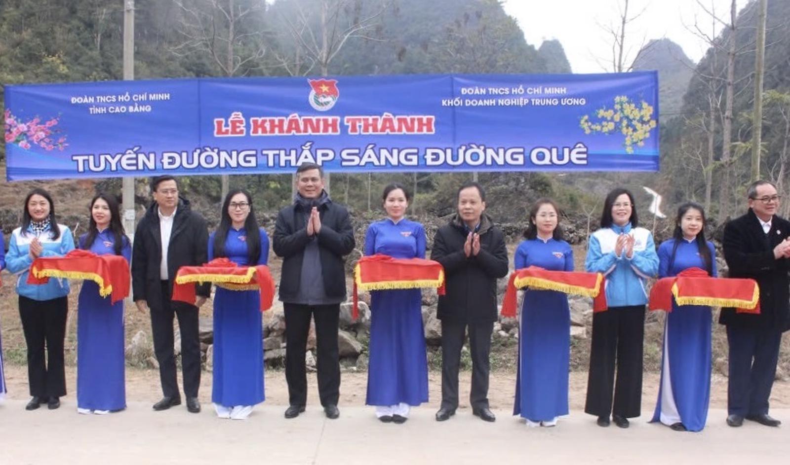 Các đồng chí lãnh đạo cắt băng khánh thành công trình “Thắp sáng đường quê” xóm Nặm Đin, xã Cải Viên, huyện Hà Quảng. Ảnh: BCB