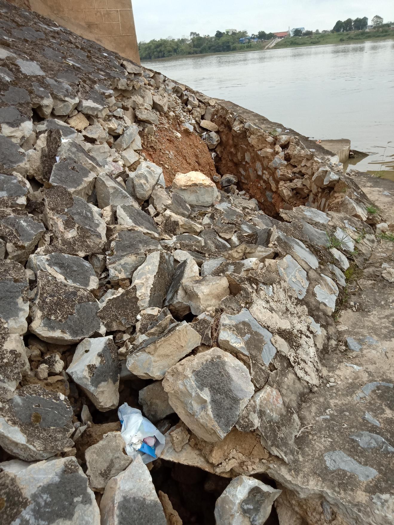 Khu vực chân cầu xuất hiện nhiều điểm sạt lở, gây nguy hiểm cho thân cầu Hàm Rồng lịch sử. Ảnh: VT