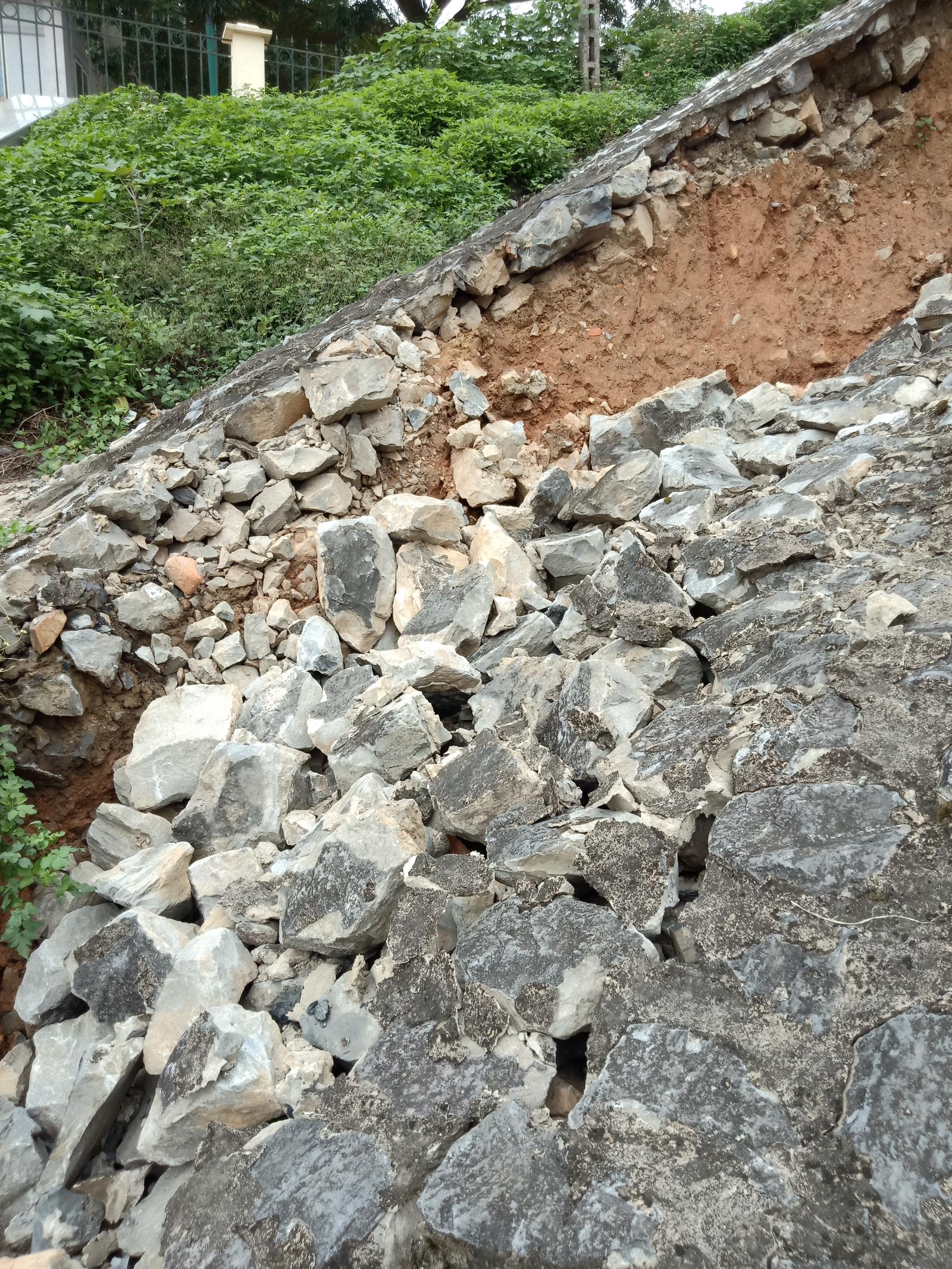 Phần tứ nón mố cầu đang bị sạt trượt, các tảng đá không còn độ kết dính, gây nguy hiểm cho đường sắt Bắc Nam. Ảnh: VT