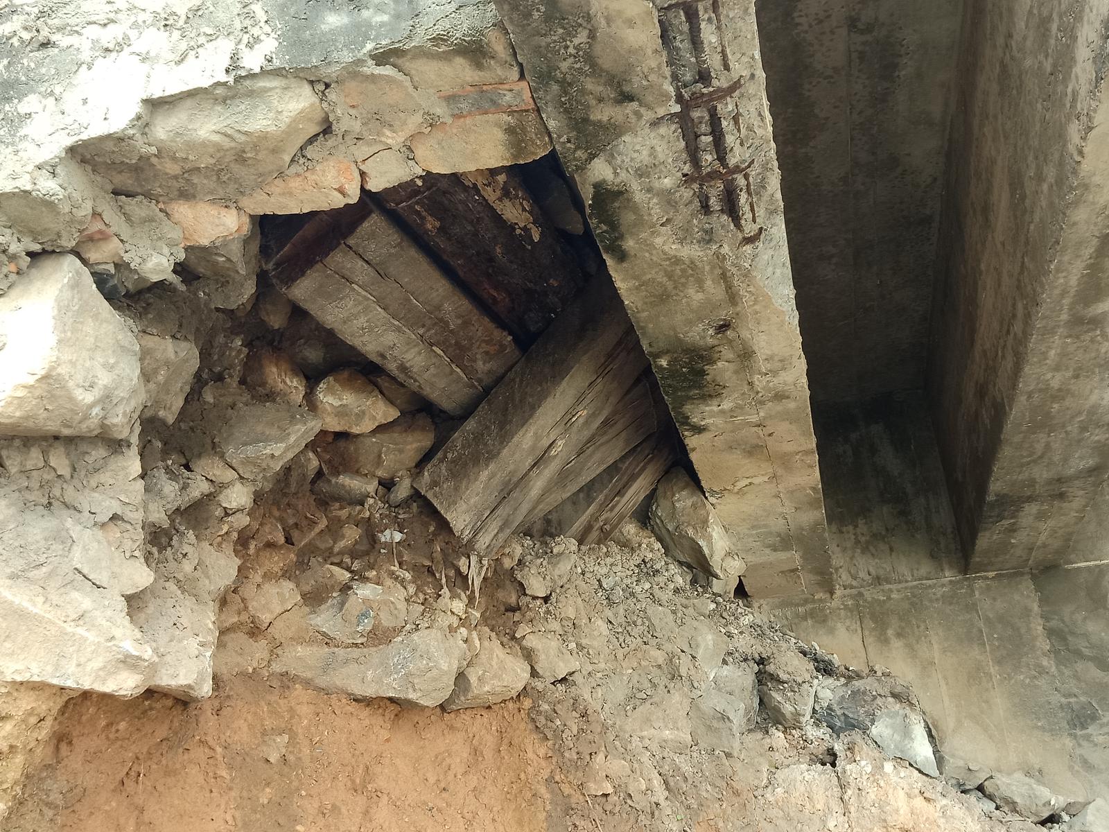Phần gỗ và thép bê tông cũng lòi ra do sạt trượt phần móng cầu, cần phải được gia cố ngay. Ảnh: VT