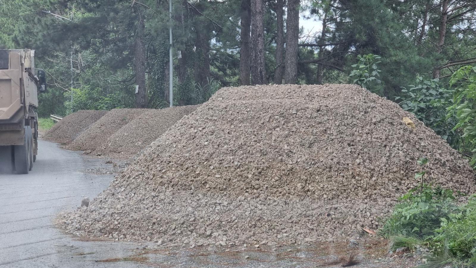 Tại một số điểm đã được đơn vị thi công cào mặt đường và đổ nhiều đống đá bên lề đường được cho là để làm lớp cấp phối. Quan sát bằng mắt thường, hầu hết các đống đá được đổ bên đường này bám rất nhiều bùn, đất.