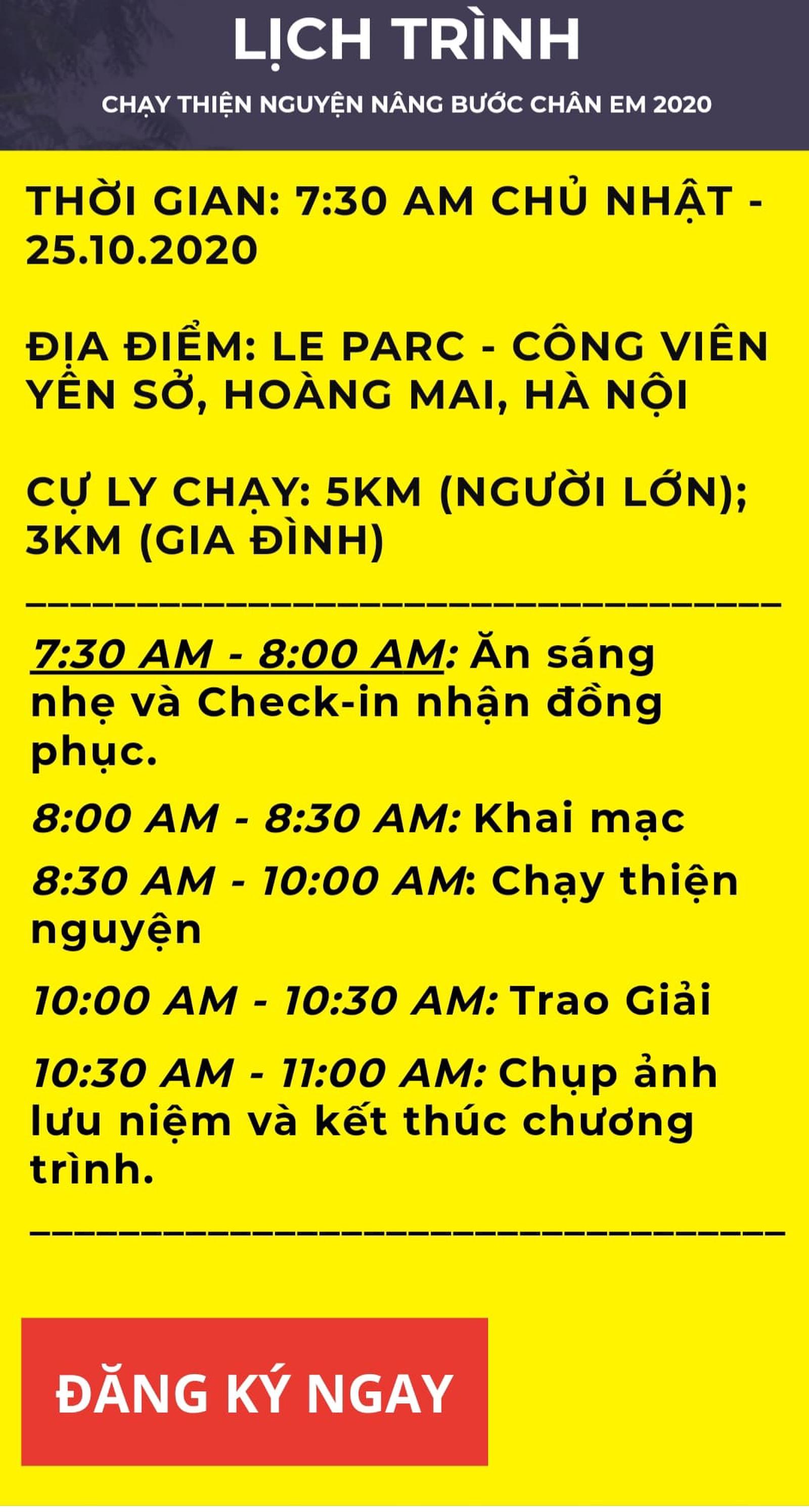 Chương trình chạy thiện nguyện “Nâng bước chân em” năm nay sẽ diễn ra vào ngày 25/10 đường chạy Le Parc by Gamuda (Công viên Yên Sở, quận Hoàng Mai, Hà Nội).